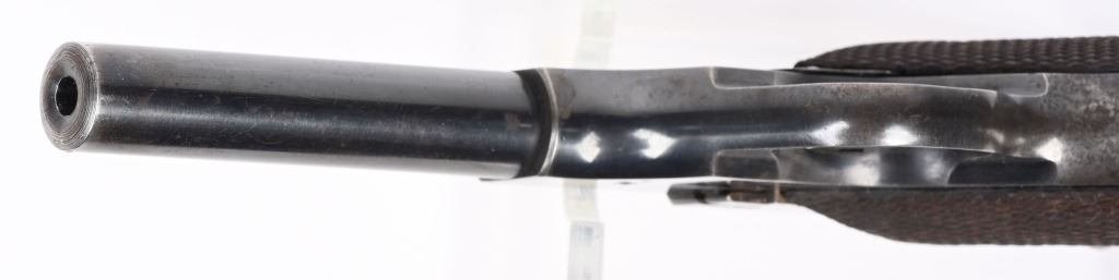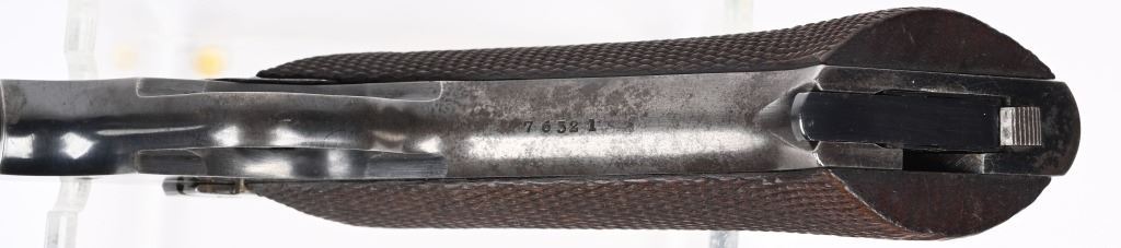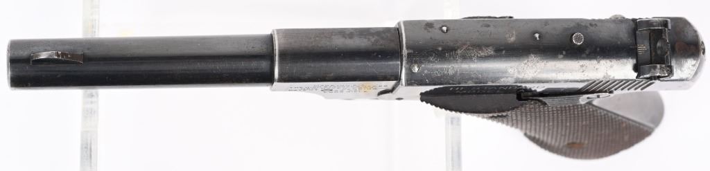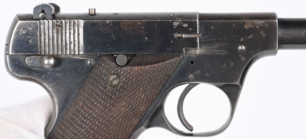 SERIAL 76321. BARREL 4.5". CALIBER 22 LR. MADE IN 1940. Hammerless model, adjustable rear sight, blue finish, checkered walnut grips, proper two tone tempered magazine. Condition. Straps are worn. Thinning barrel blue, overall high edge wear. Holster worn gun with about 70% blue remaining. Bore is fine. C&R
