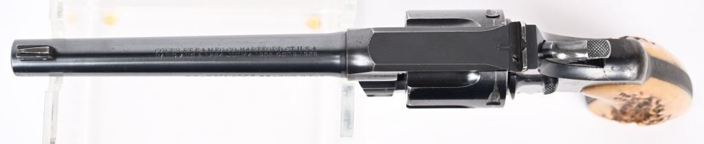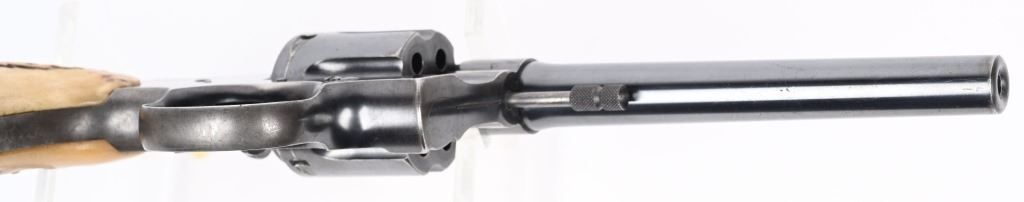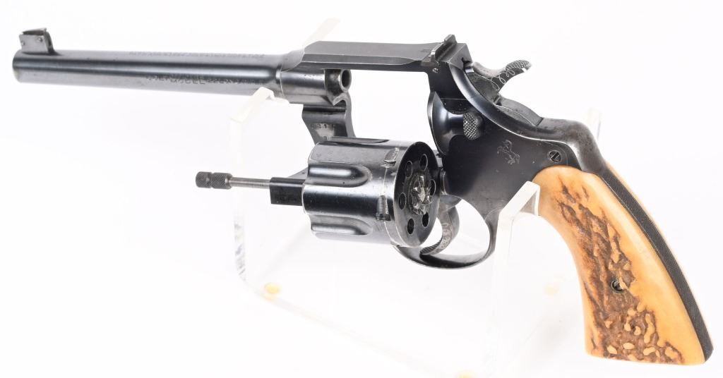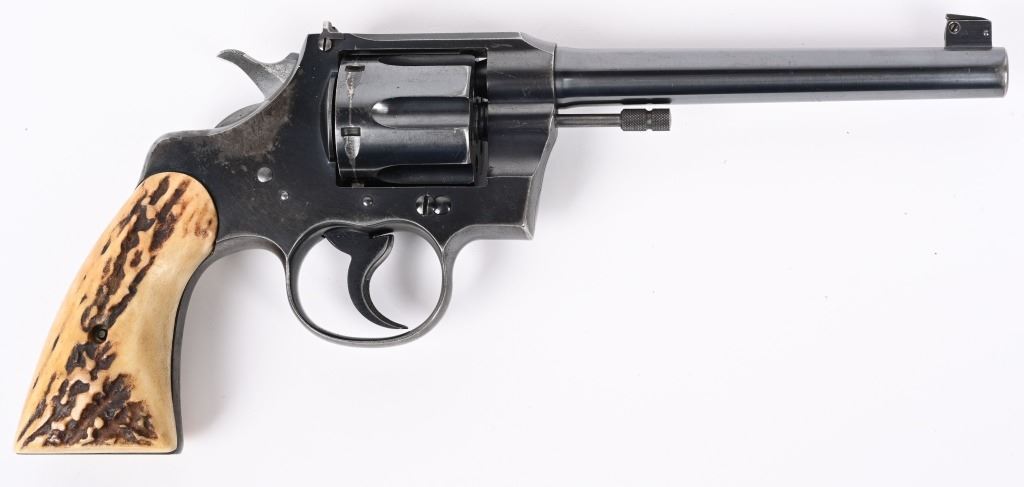 SERIAL 6310. BARREL 6". CALIBER 22LR. MADE IN 1931. Features flat top frame, adjustable sights, blue finish and sporting a pair of genuine stag grips. Condition. Straps are gray. Light muzzle wear. Right side of frame has 3/4 area of patina. Overall, about 80% blue. Grips are excellent. Bore is excellent. Action works fine. C&R