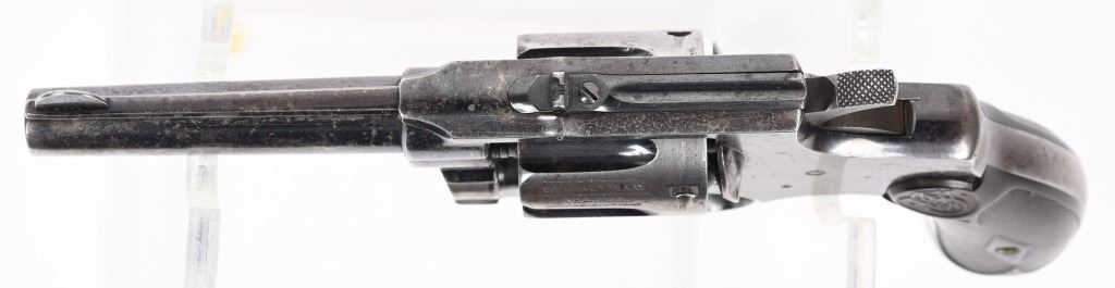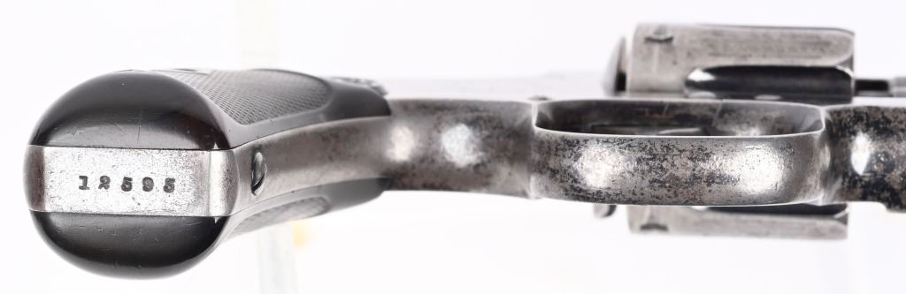 SERIAL 12505. BARREL 3 1/4". CALIBER 32 S&W LONG. MADE 1896-1903. Scarce blue finish, built on I-frame, round butt, gutta percha grips, patent stamps and dates on cylinder, 6-shot, double action. Condition. Retains about 40% blue with gray patina balance. Legends are sharp. Grips are excellent. Action works fine. Bore is excellent. C&R