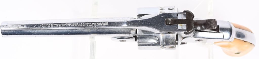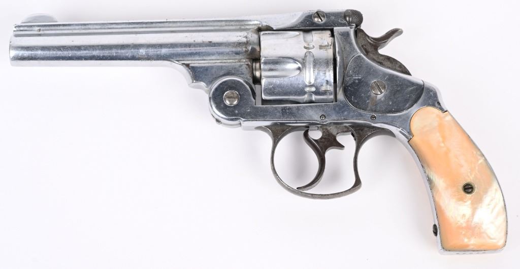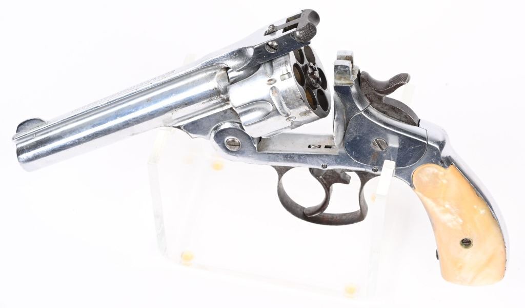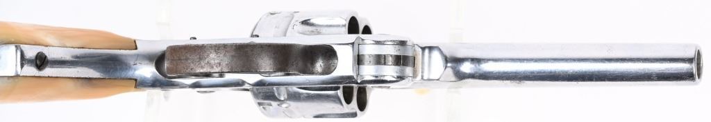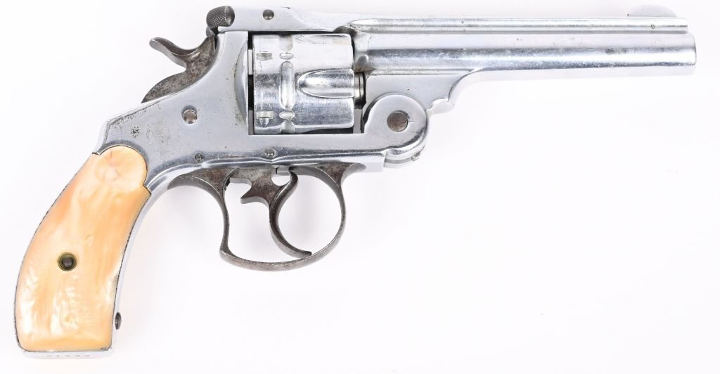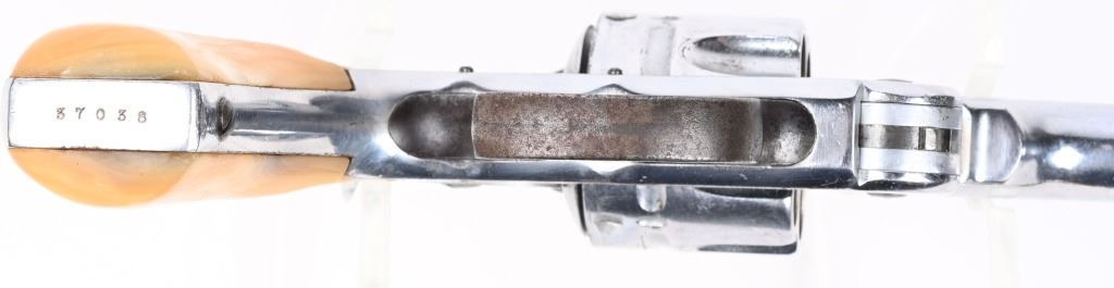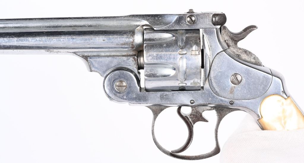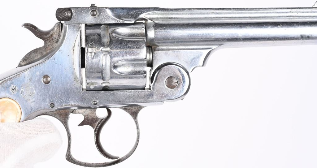 SERIAL 37038. BARREL 5". CALIBER 44 RUSSIAN. Standard top break, six shot, double action, chrome plated, pearl grips, Condition. Gun has been chrome plated but trigger guard, trigger and hammer were left as original. Most of this finish remains and all legends are still readable. Grips are excellent, real pearl. Needs some timing attention, as it works some of the time. Matching serial numbers. Bore is excellent. Antique