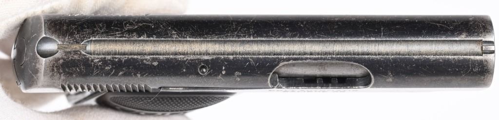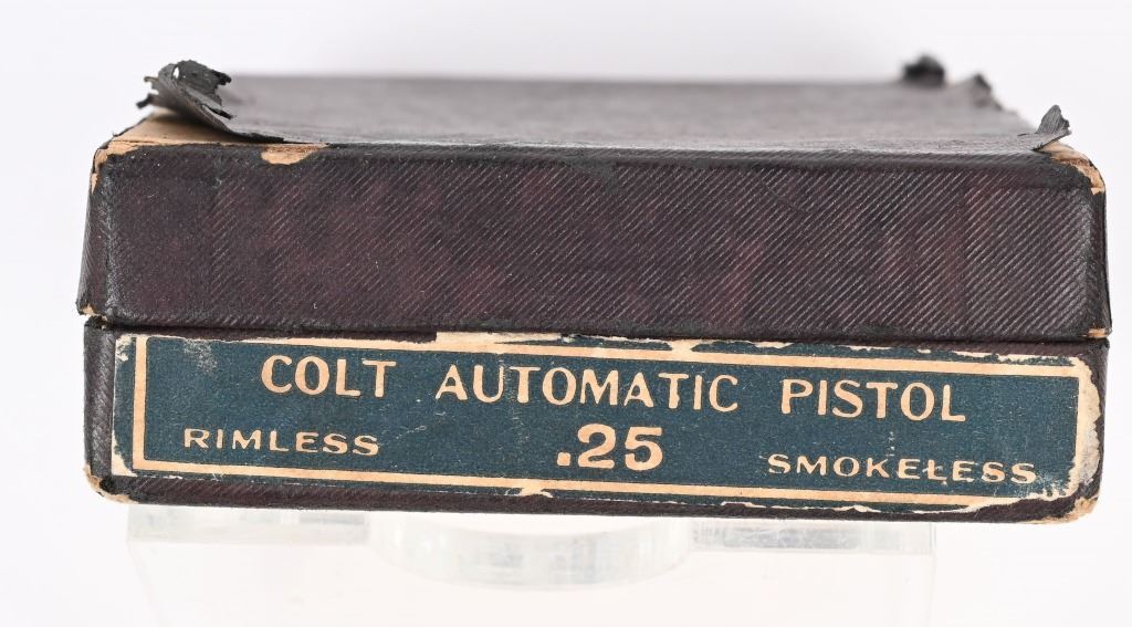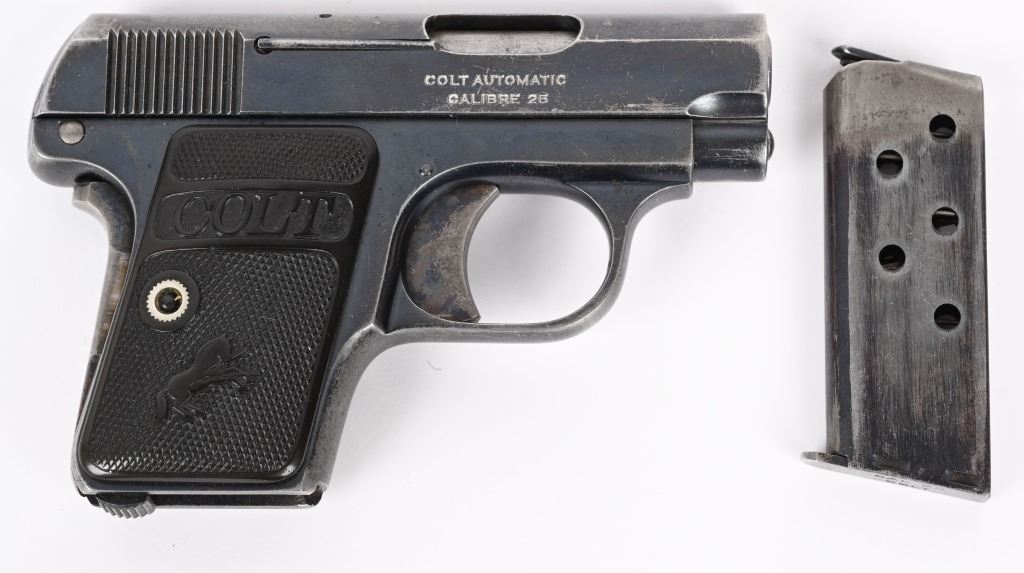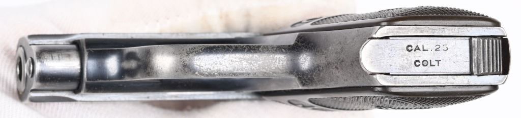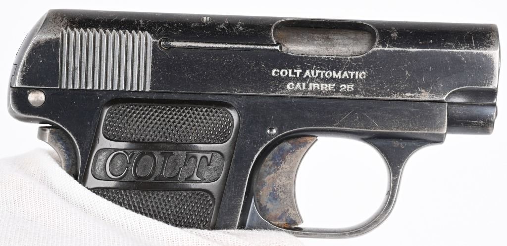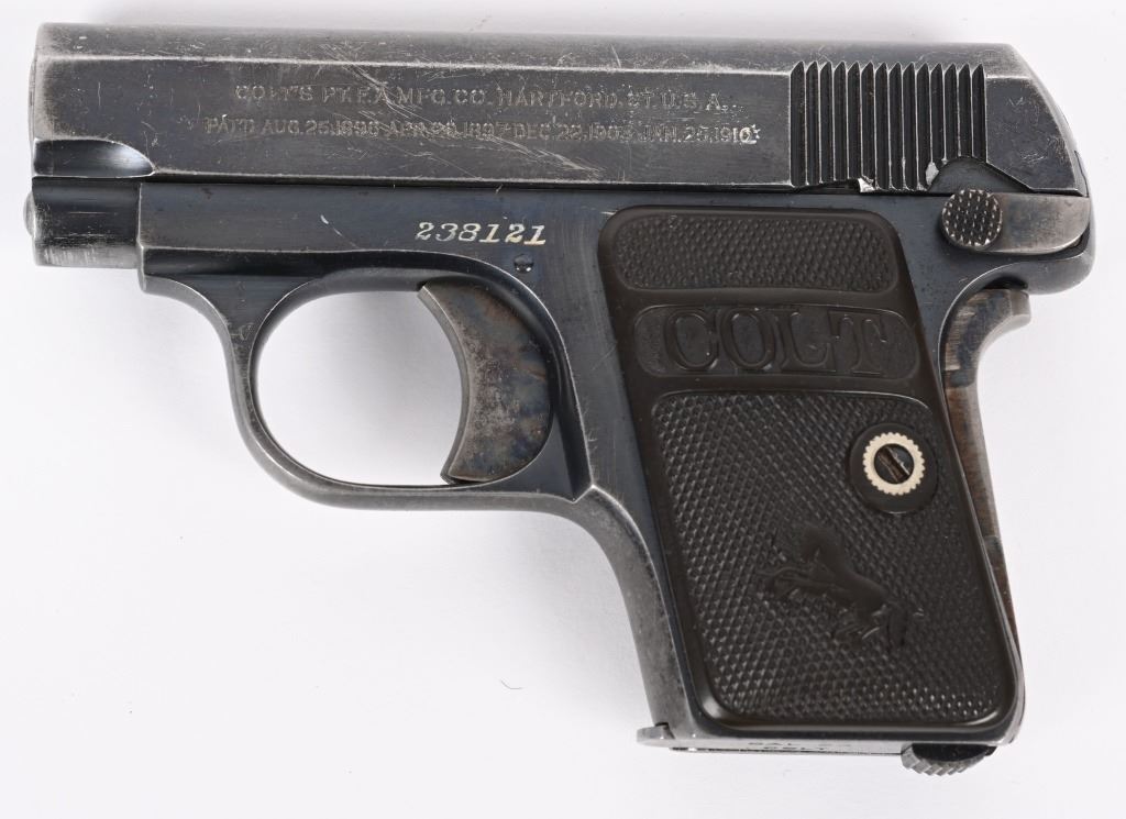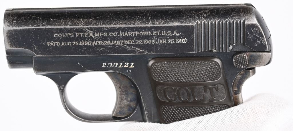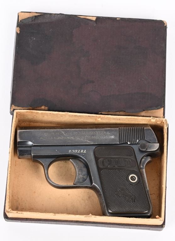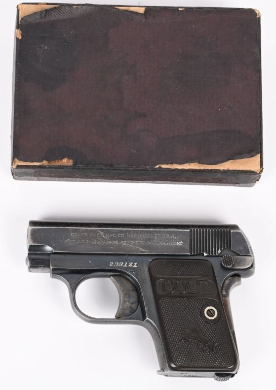 SERIAL 238121. BARREL 2". CALIBER 25 ACP. MADE IN 1920. Standard blue finish, case color trigger and grip safety, fixed sights, gutta percha grips, Comes with tempered Colt stamped magazine and proper box numbered to gun "394395". Condition. 85% overall blue with scattered wear, freckling, etc. Grips are excellent. Good case color on trigger. C&R