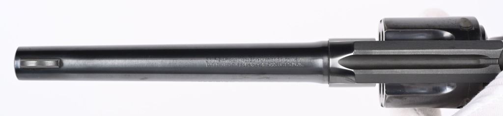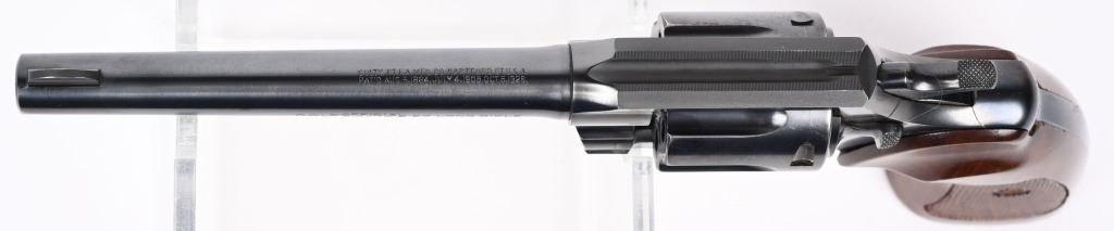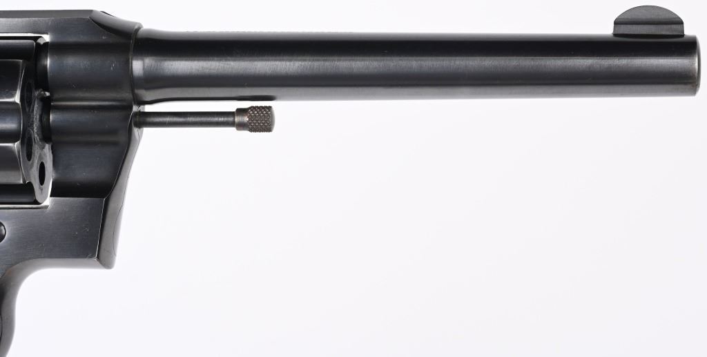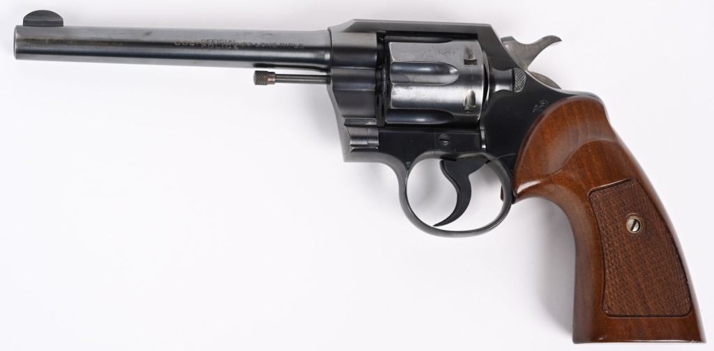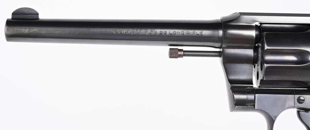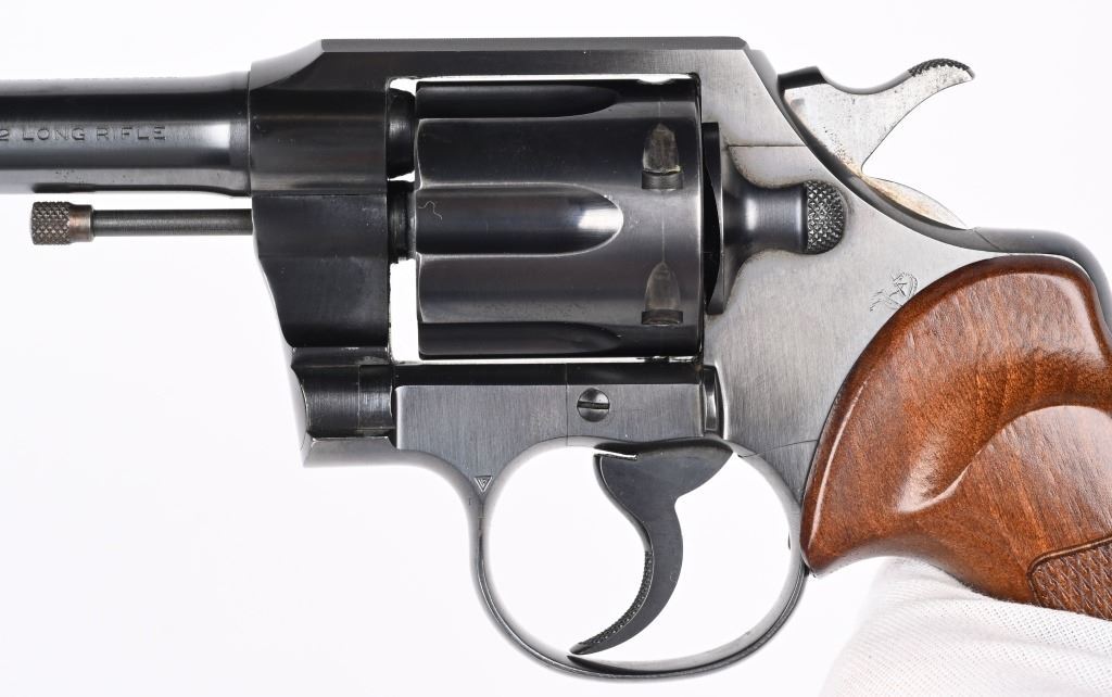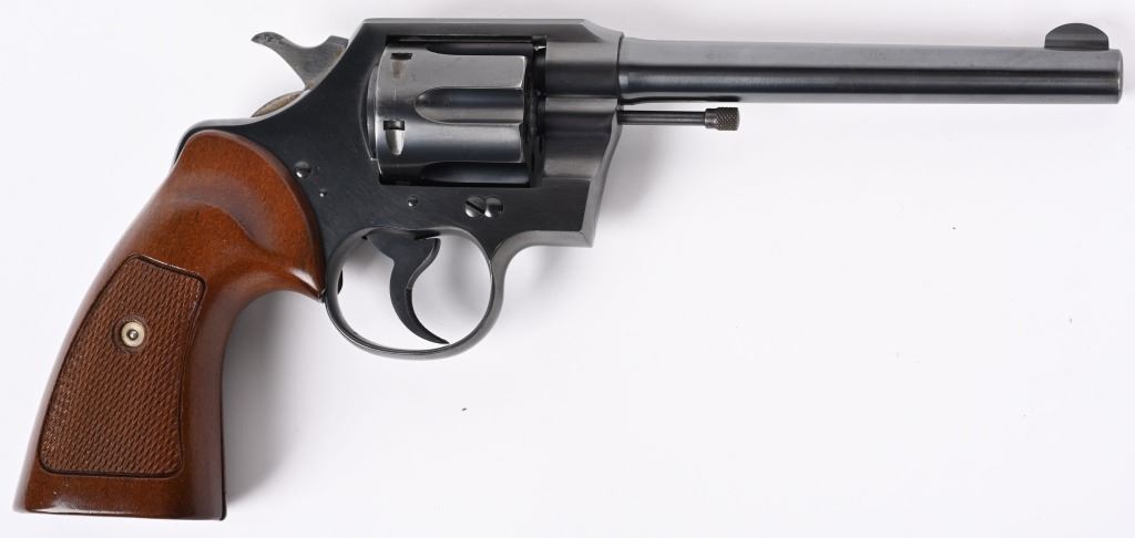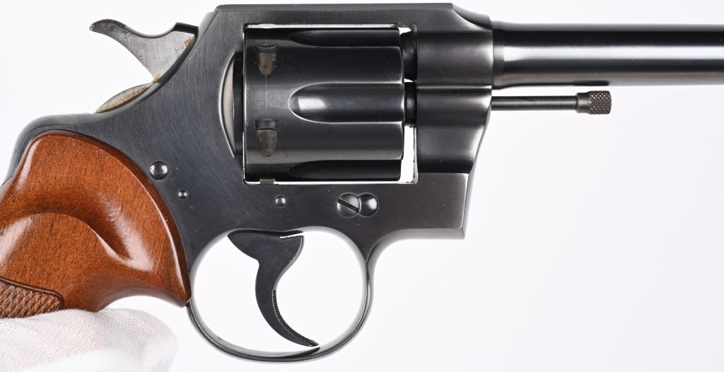 SERIAL 13969. BARREL 6". CALIBER .22 LR. MADE IN 1939. Fairly hard to find Colt in this caliber. Features fixed sights, blue finish, six shot, double action. Checkered walnut grips are more recent replacements. Condition. Gun has seen very little use and retains approximately 98% blue, with fine bore and action. C&R