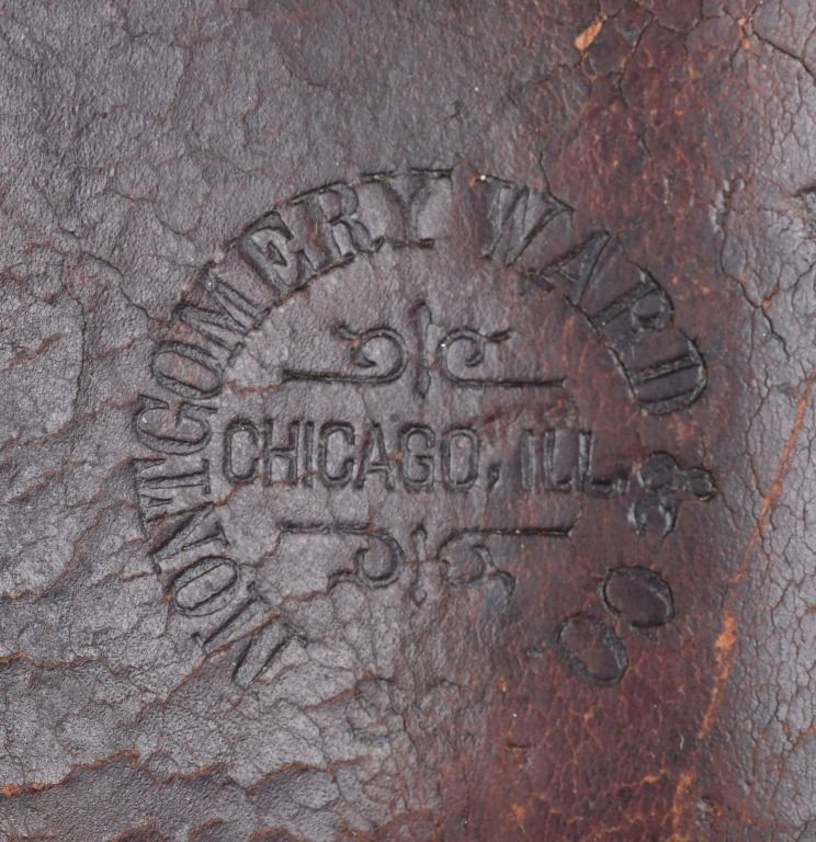 Both the money cartridge belt and holster are stamped with Wards stamp. The holster is also stamped 7 1/2 on loop. Belt holds 44/ 45 caliber. These mail order catalogs and holsters were popular in the west, during the 1890's, often because that was the only way they could get goods and they were more affordable than those made by contemporary leather craftsmen. Belt measures 36" from buckle post to middle hole in billet. . Skirt has couple of repairs and there is some checking but still very good and a great add on for your Wards shipped Colt SAA.