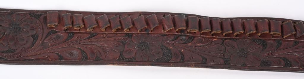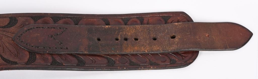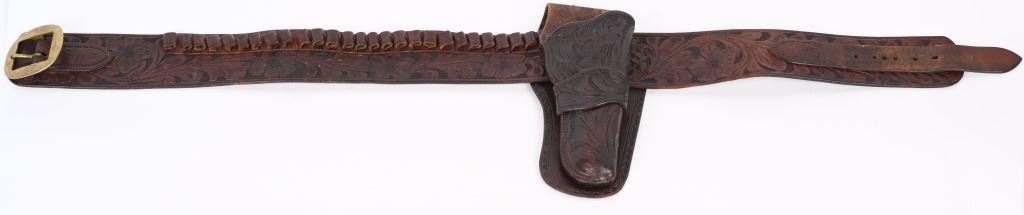 Only the highest quality you could purchase during the Prohibition Years where Single Actions still rained supreme out west. Thick saddle leather, deeply hand tooled . Holster made for a 4 3/4" Colt SAA. Size 52 marked belt. Loops take a .41 Colt but it is tight, a 32-20 is probably best. This rig is in remarkable condition and could still be used on a daily basis. This is not a later Buscadero rig. Belt measures 38.5" from buckle post to middle hole in billet.