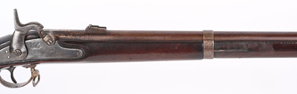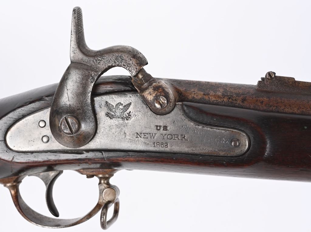 BARREL 40". CALIBER 58. Made in NEW YORK with most of the parts contracted from " Alfred Jenks & Son PHIL". Only made in 1862-63 with total made about 5140. Lock is stamped "US NEW YORK 1862" with eagle. Standard features include 3-bands, two leaf rear sight, full length walnut stock, steel ramrod and sling swivels. Metal finished in the white. Condition. Metal is smooth homogenous patina with usual minor corrosion near breech. Stock is excellent with some added finish. Bore is very good. Most of these saw heavy war service and very few survived and this example is in fine condition overall. ANTIQUE