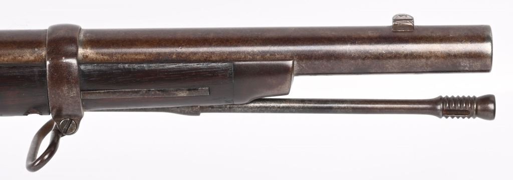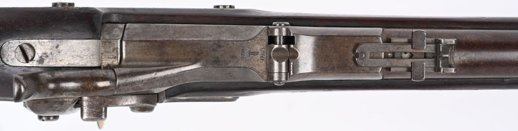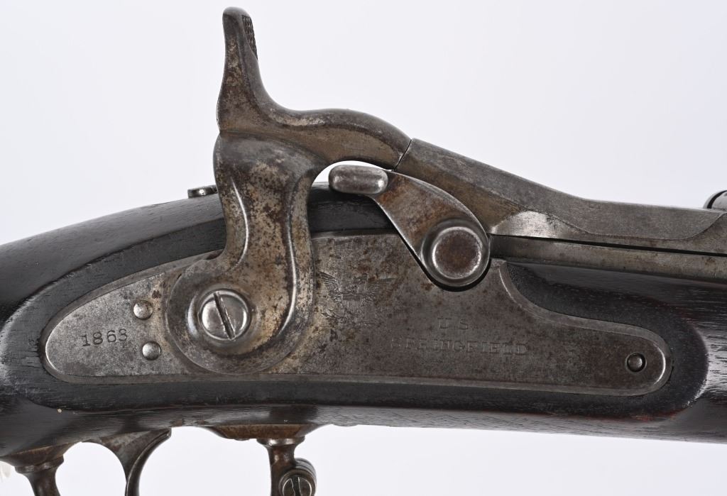 SERIAL 11583. BARREL 32.5". CALIBER 50-70. MADE 1868-72. Lock is dated "1863" with "US SPRINGFIELD" & eagle. Block is dated "1869" with "US" and "eagle head". Matching serial number on left side of barrel & frame. Full length walnut stock has two cartouche stamps on left side. Features 900 yard folding military rear sight, 2-bands, full metal ramrod, sling swivel. Condition. Smooth patina. Legends are sharp. Bore is bright. Stock is excellent with usual minor abrasions and impressions. ANTIQUE