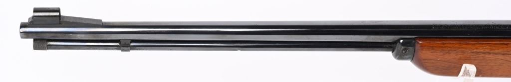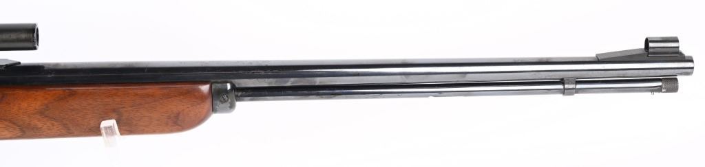 SERIAL NUMBER: J9243. BARREL: 24". CALIBER: .22LR. MANUFACTURED: 1952. "JM" stamped barrel. Standard takedown model. Hooded ramped front sight and u-notch leaf rear. Re-blued metal components. Oiled wood stock and plain forearm. Includes attached Weaver B6 scope. CONDITION: Metal is very good overall, with light wear and a few scratches. Wood has a few minor scrapes and scratches. Bore is shiny with crisp rifling. Mechanically fine. Scope has exterior handling marks, and a light fog. C&R