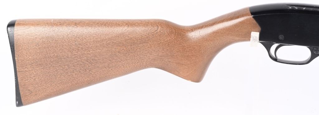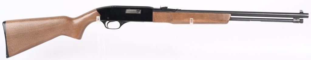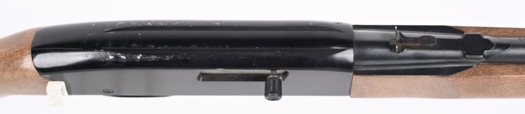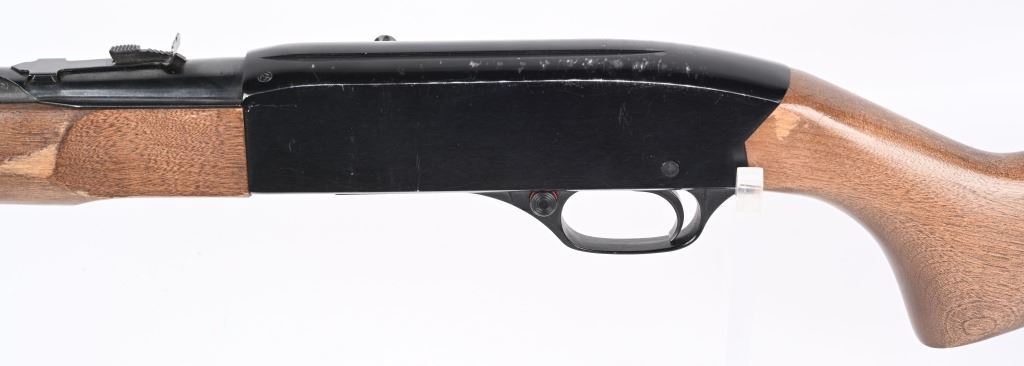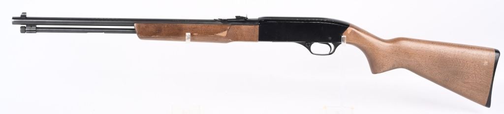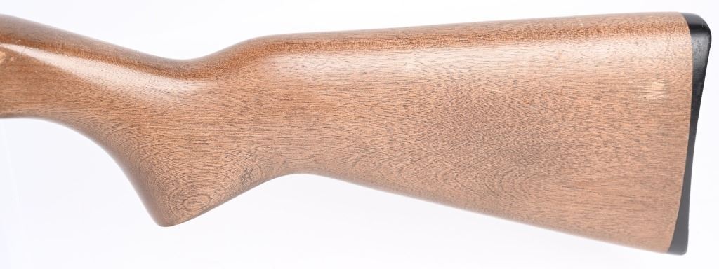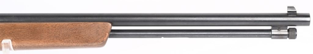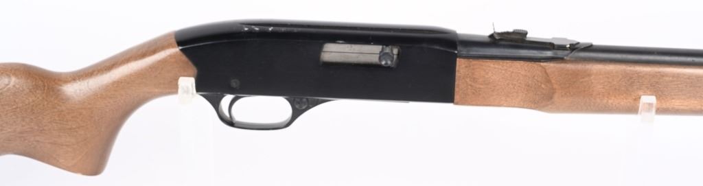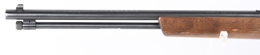 SERIAL NUMBER: B1279664. BARREL: 20-1/2". CALIBER: .22LR. MANUFACTURED: Early 1970's. Standard markings and features. Tube feed. Blade front sight and u-notch rear. Original blued/black finishes. Oiled wood stock and furniture. Serrated plastic butt plate. CONDITION: Metal is very good overall, with general wear. Wood has handling marks, scrapes and scratches. Bore is shiny, with strong rifling. Mechanically fine. C&R