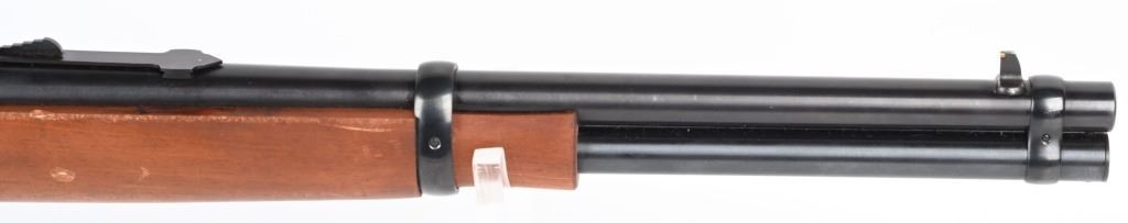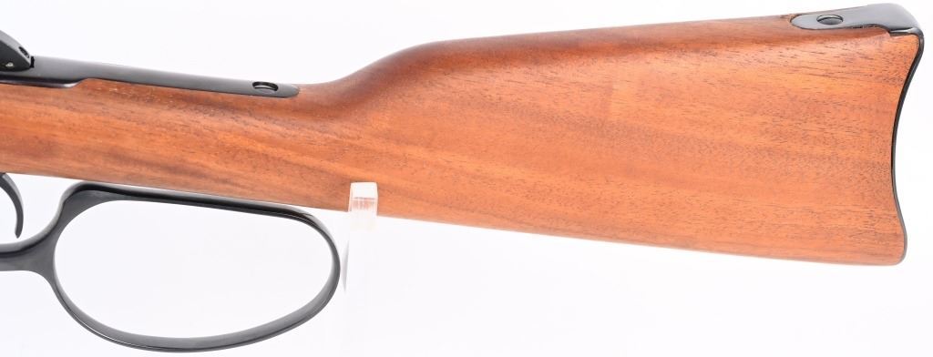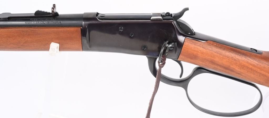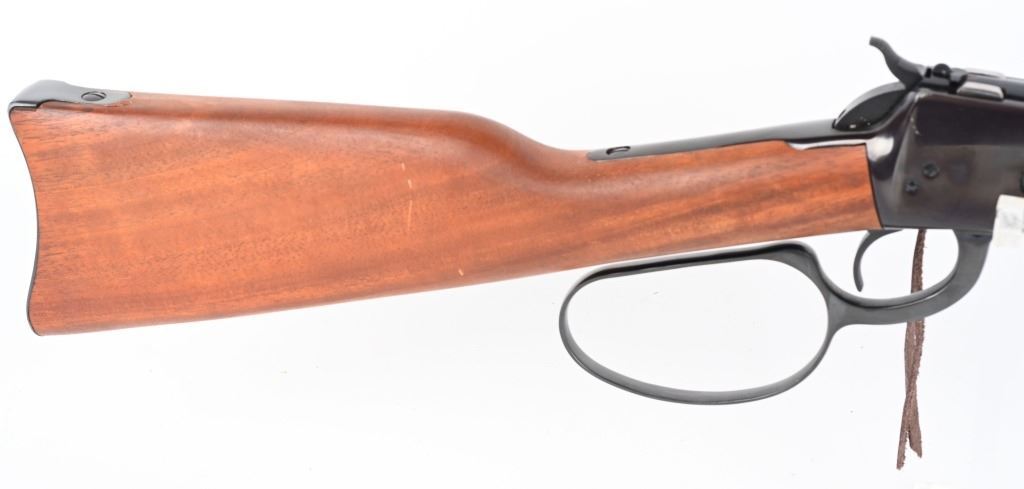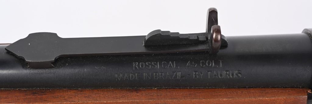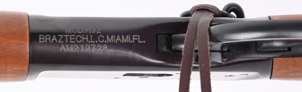 SERIAL NUMBER: AM212728. BARREL: 16". CALIBER: .45 COLT. MANUFACTURED: 2000's. Brazilian made copy of the Winchester Model 1892. Trapper length barrel with a saddle ring on the frame. Blade front sight and buckhorn u-notch rear. Original blued finish and oiled wood furniture. Smooth metal butt plate. Flip safety on the bolt. CONDITION: Metal is excellent overall. Wood has a few handling marks, scrapes and scratches. Bore is shiny with crisp rifling. Fine mechanics. MODERN