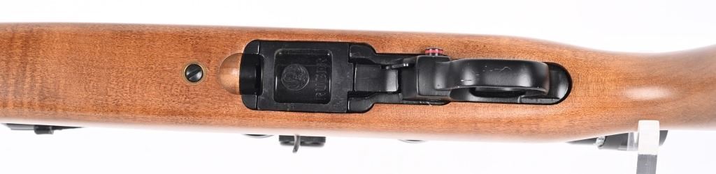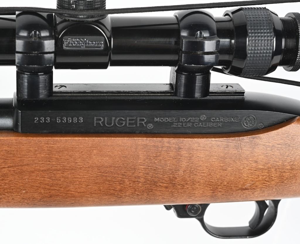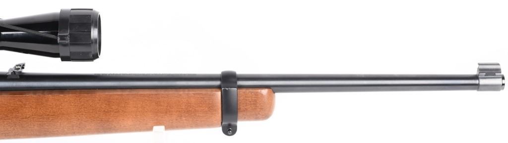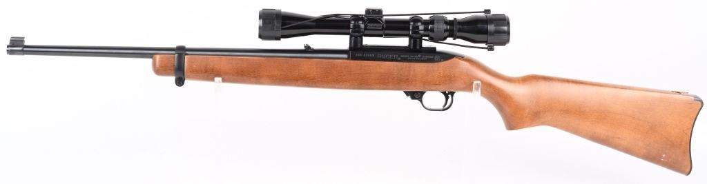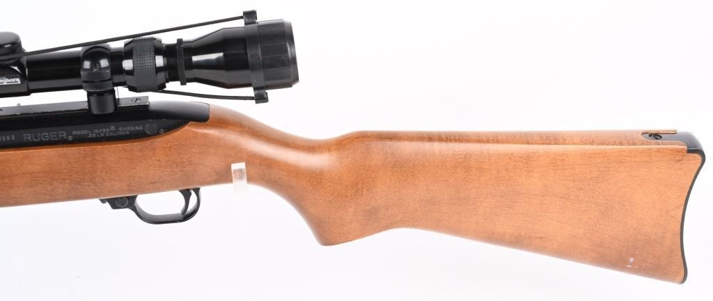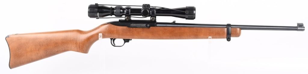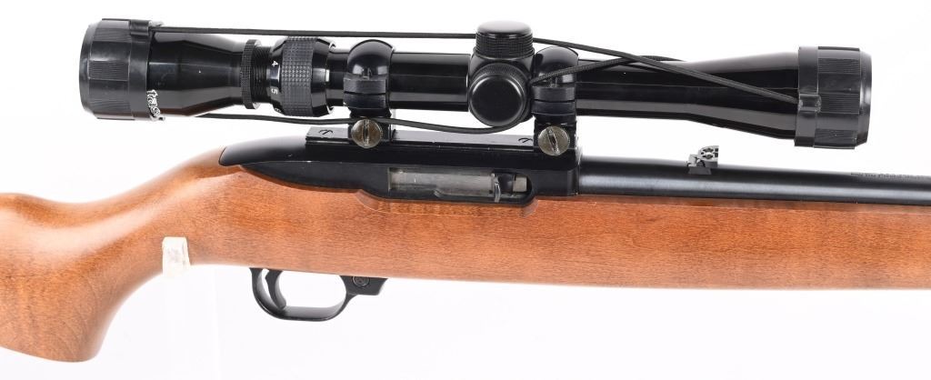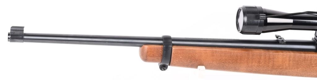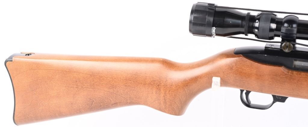 SERIAL NUMBER: 233-53983. BARREL: 18-1/2". CALIBER: .22 LR. MANFACTURED: 1990. Standard blade front sight and flip up u-notch rear. Factory drilled for scope bases. Original blued/black finishes. Oiled wood stock and plastic butt plate. Includes factory 10 round rotary magazine and attached Tasco Pronghorn 3-9X scope. CONDITION: Metal is excellent overall, as is the wood, with both having a few handling marks. Bore is shiny with crisp rifling. Mechanically fine. Scope is clear. MODERN