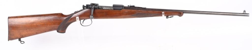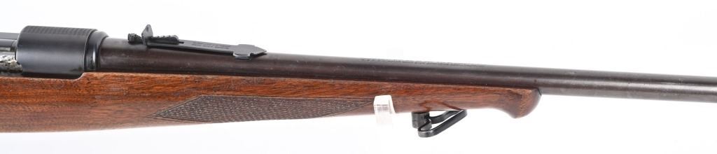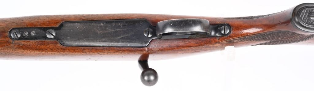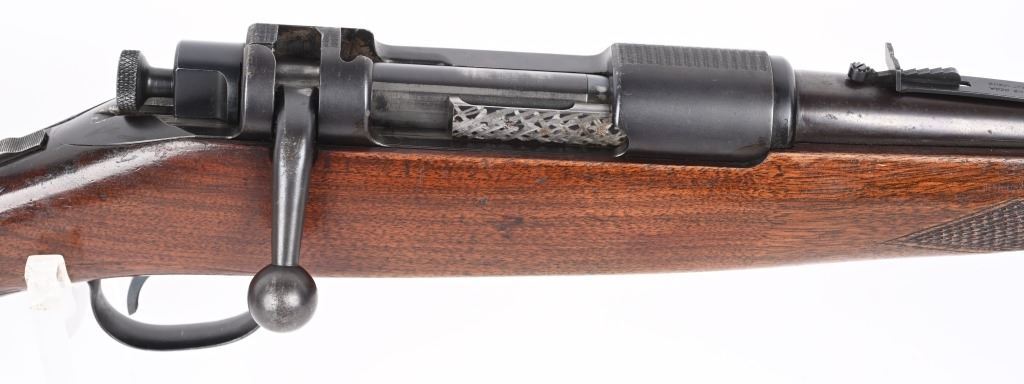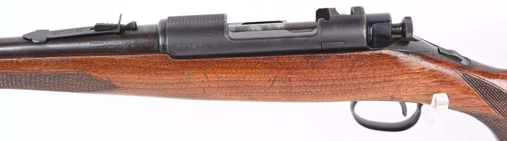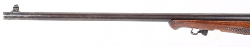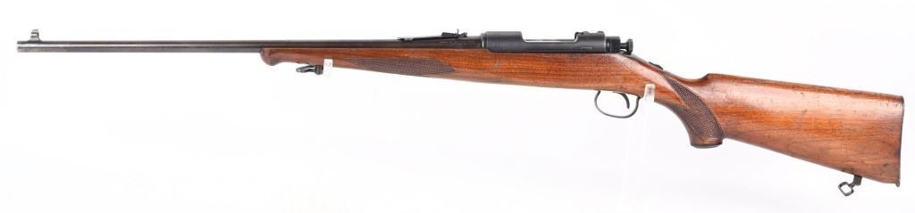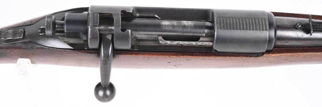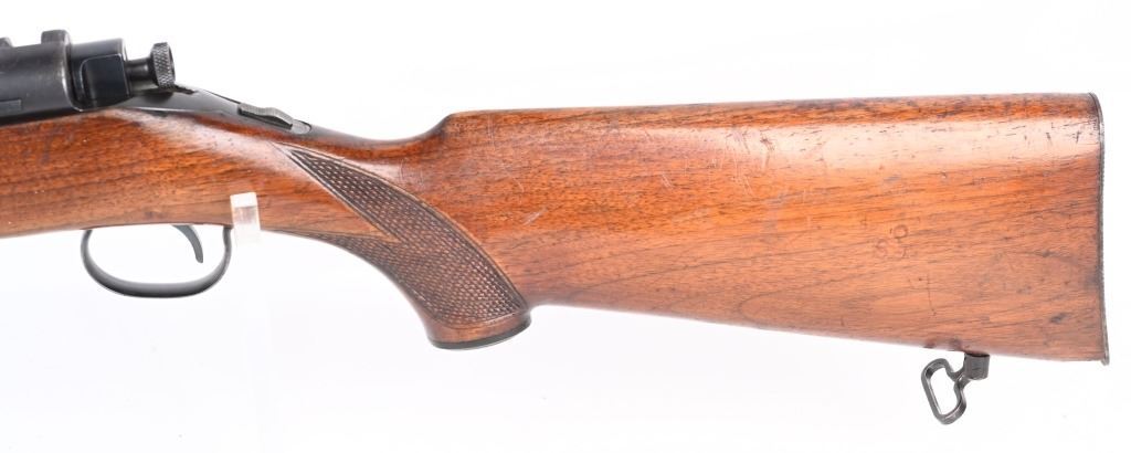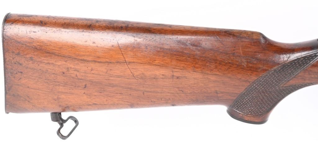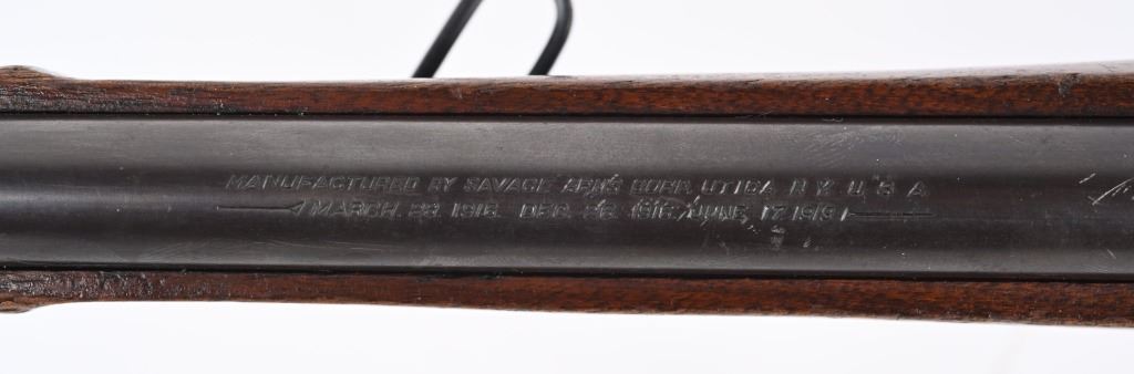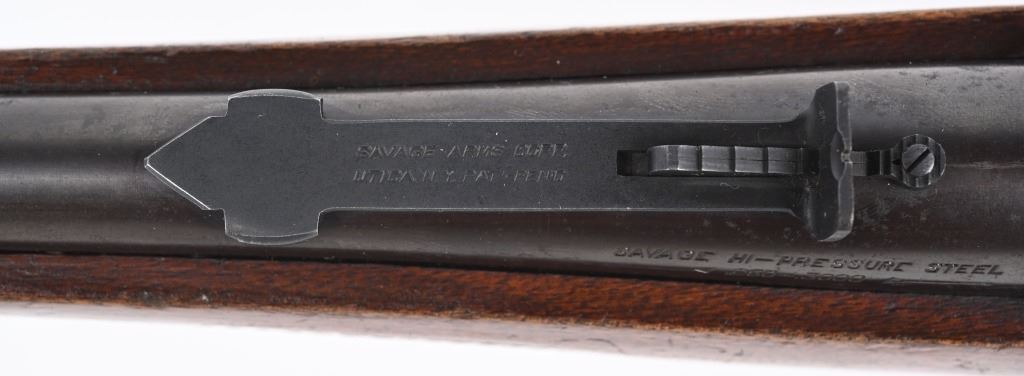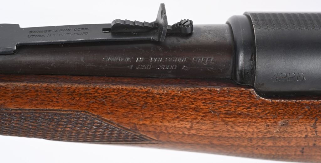 SERIAL NUMBER: 4226. BARREL: 22". CALIBER: .250-3000. MANUFACTURED: 1920'S. Standard markings and patent dates on the barrel. Blade front sight and u-notch rear leaf. Tang safety. Original blued finish. Oiled wood stock with a plastic capped pistol grip. Serrated metal butt plate. CONDITION: Metal is good overall with wear and general brown patina on the barrel. Wood has finish wear, handling marks and scratches. The toe of the stock is chipped. Bore is shiny with strong rifling. Mechanically fine. C&R