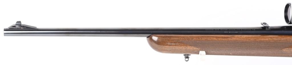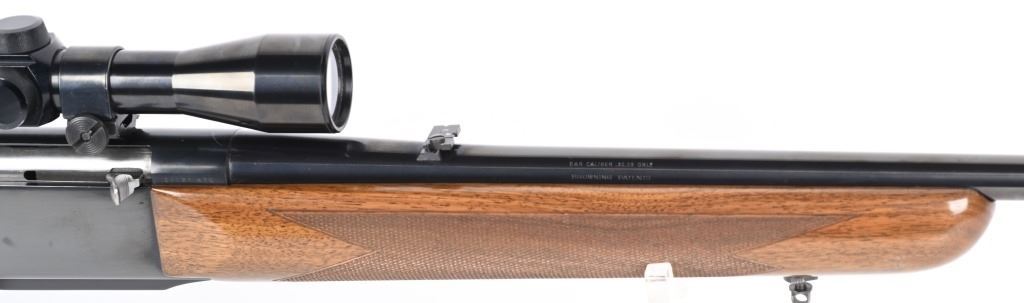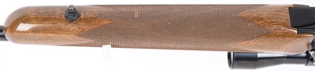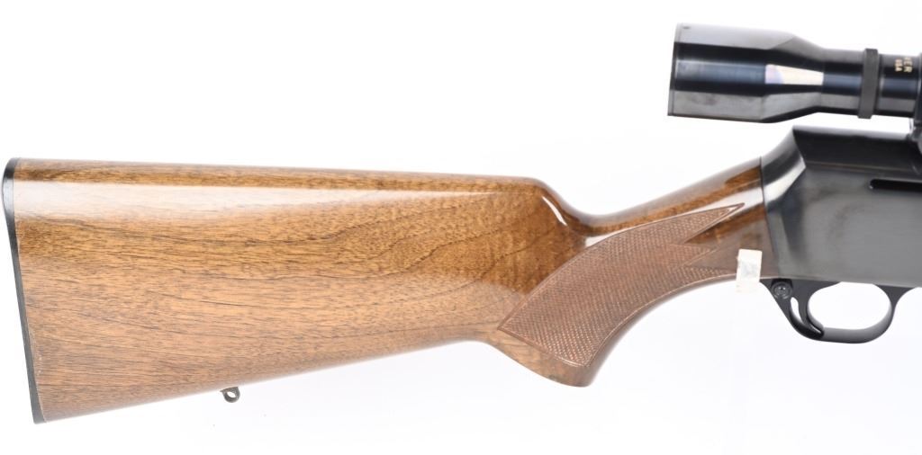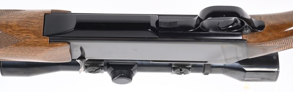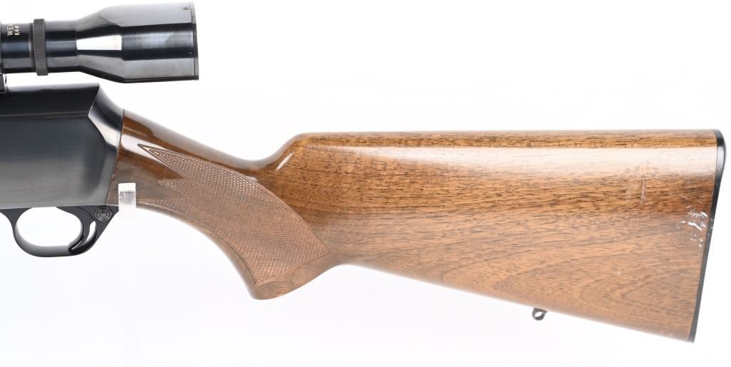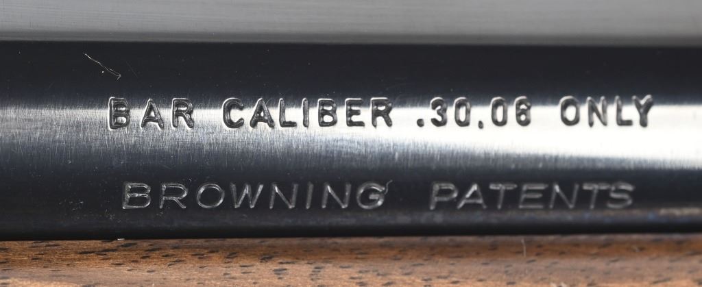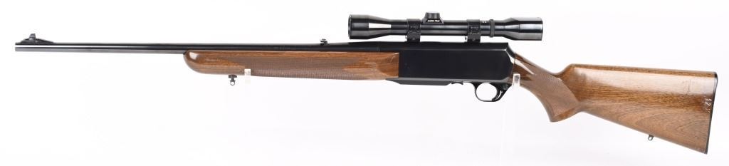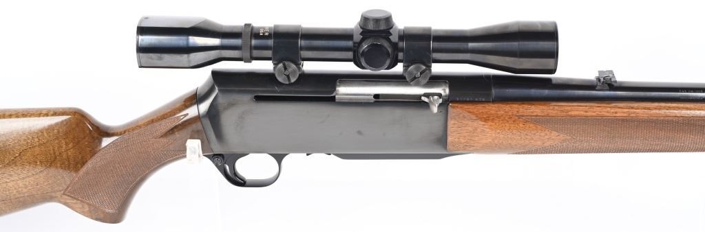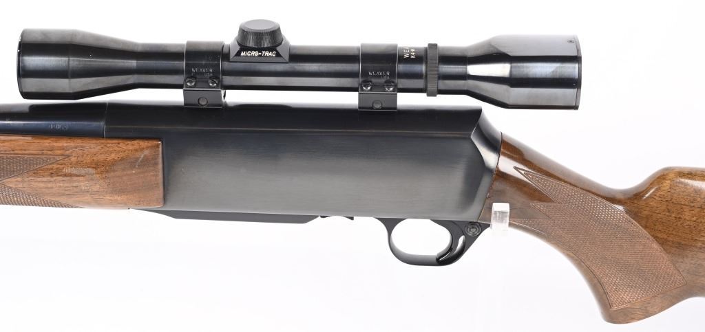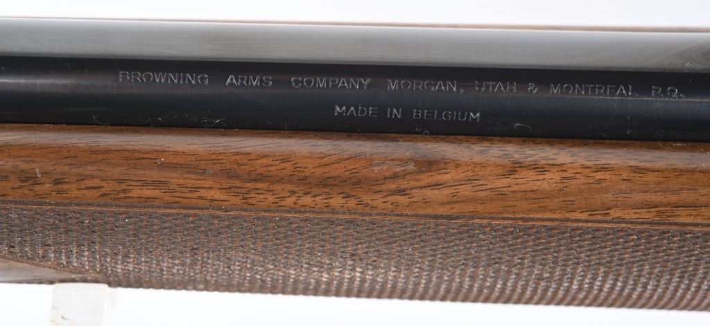 SERIAL NUMBER: 31781M74. BARREL: 22". CALIBER: .30-06. MANUFACTURED: 1974. Made in Belgium. Fold down box magazine. Ramped blade front sight and flip up u-notch rear. Factory blued finish on the metal components. Lacquered wood furniture, with fine checkering on the wrist and forearm. Original plastic butt plate. Includes attached Weaver K4W scope. CONDITION: Metal is excellent overall, with general scratches and handling marks. Wood has minor scrapes, scratches and dents. Bore is shiny with crisp rifling. Mechanically fine. Scope is excellent. MODERN