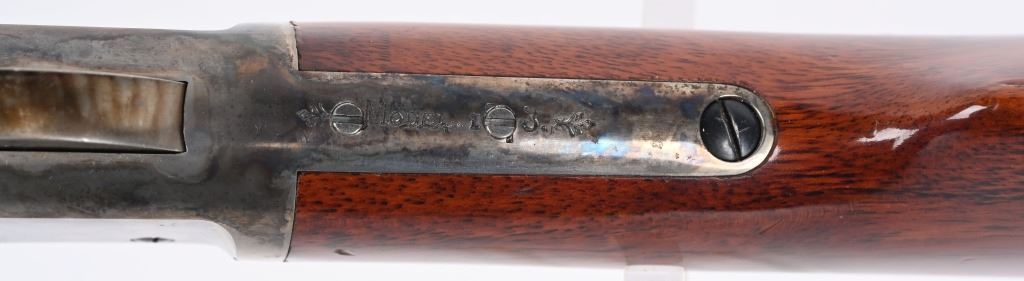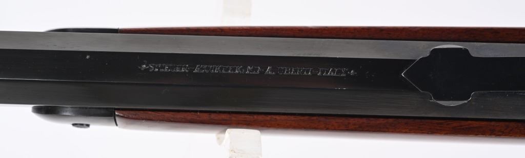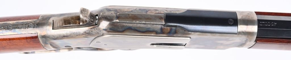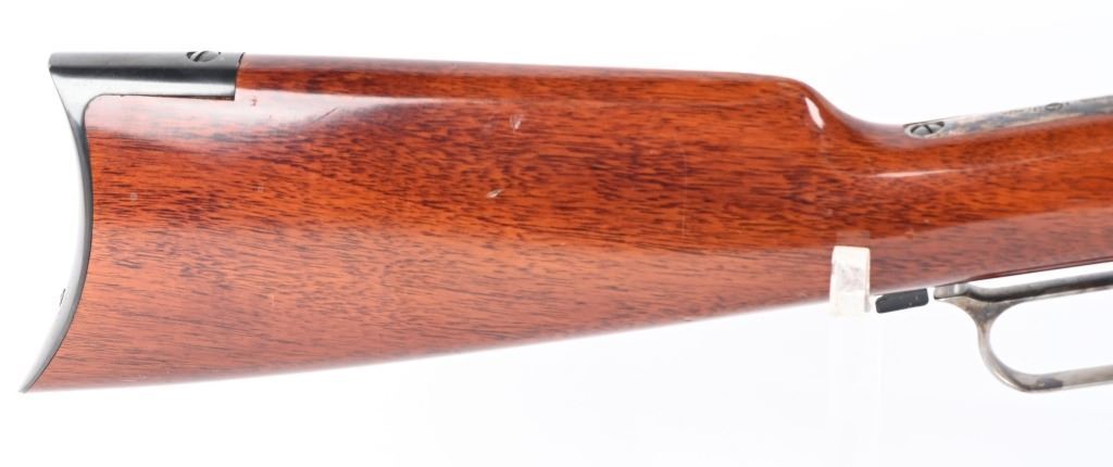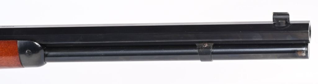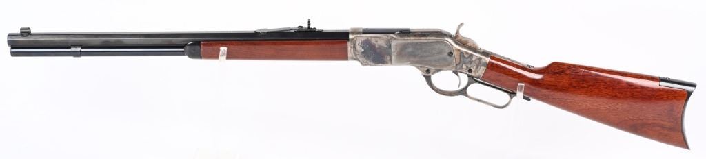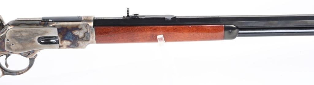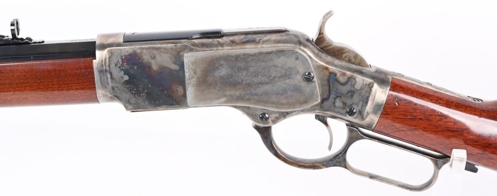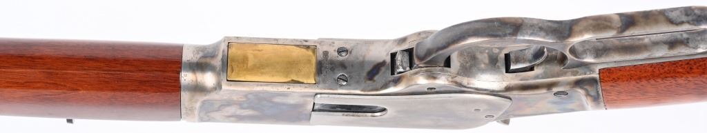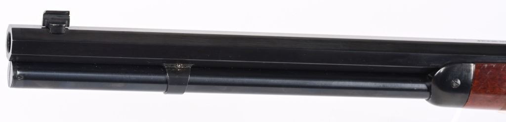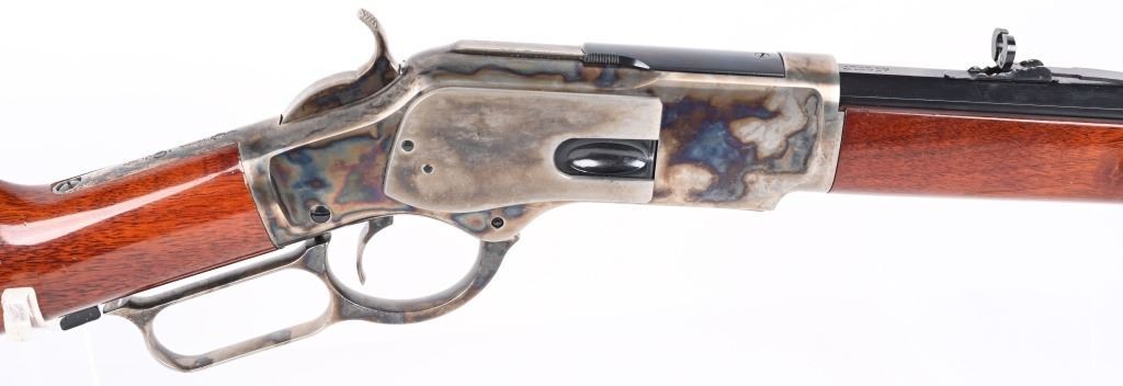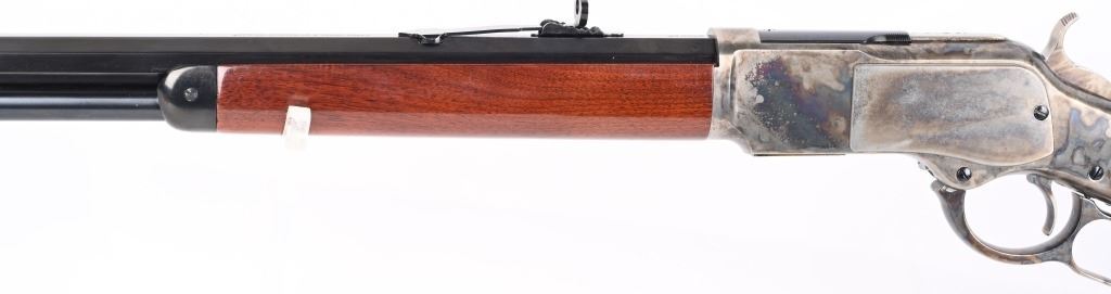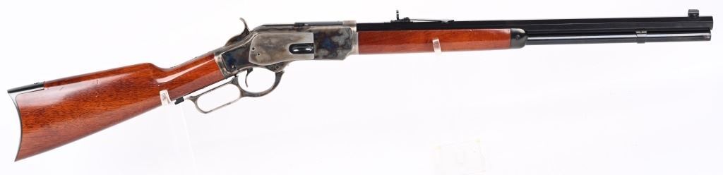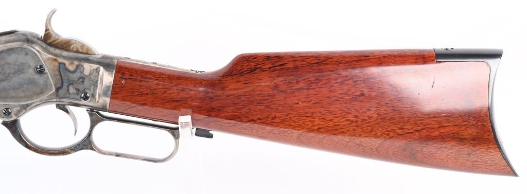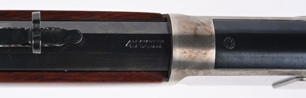 SERIAL NUMBER: W31366. BARREL: 20". CALIBER: .45 COLT. MANUFACTURED: 1990'S. Made in Italy by Uberti and imported by Stoeger. Full octagon barrel and magazine tube. Blade front sight and buckhorn u-notch rear. Original blued/case colored finishes. Laminate wood furniture. Crescent metal butt plate. Sliding metal dust cover. CONDITION: Metal is very good overall, with general wear. Most of the wear is on the frame. Tang is drilled for a sight. Wood has minor impressions and dings. Bore is shiny with crisp rifling. Mechanically fine. MODERN