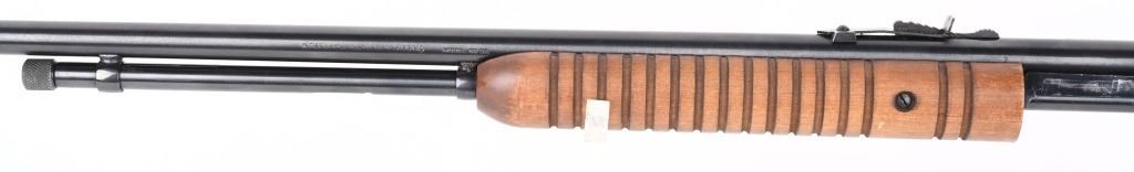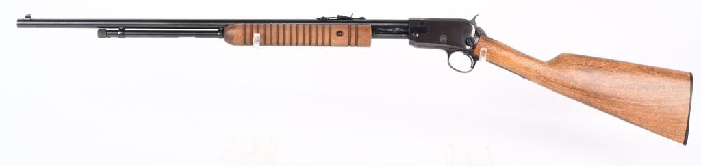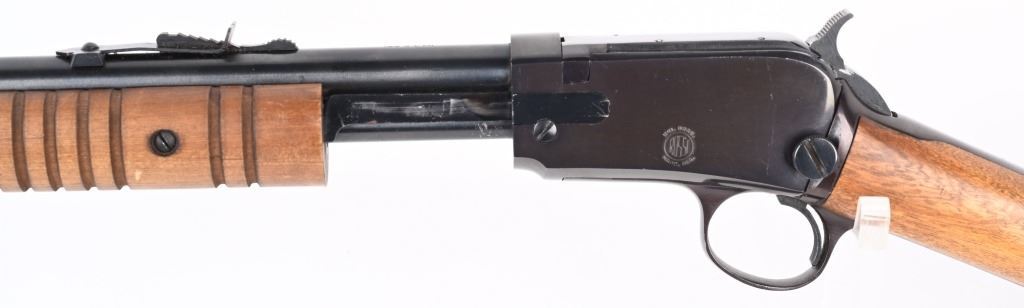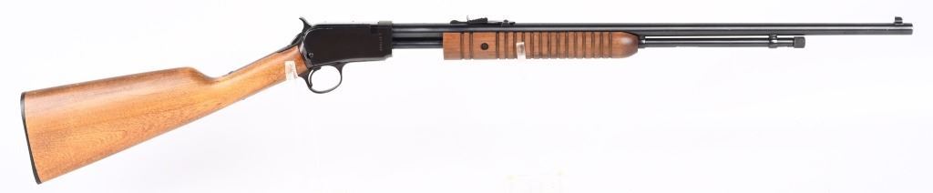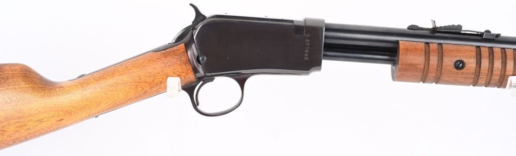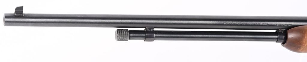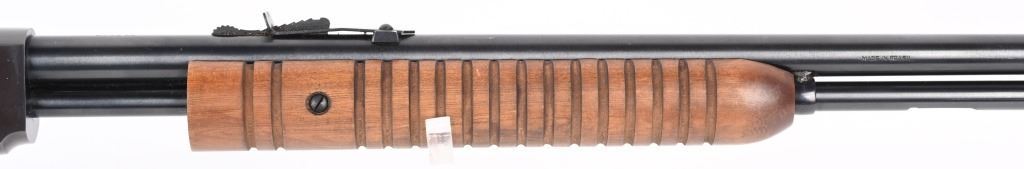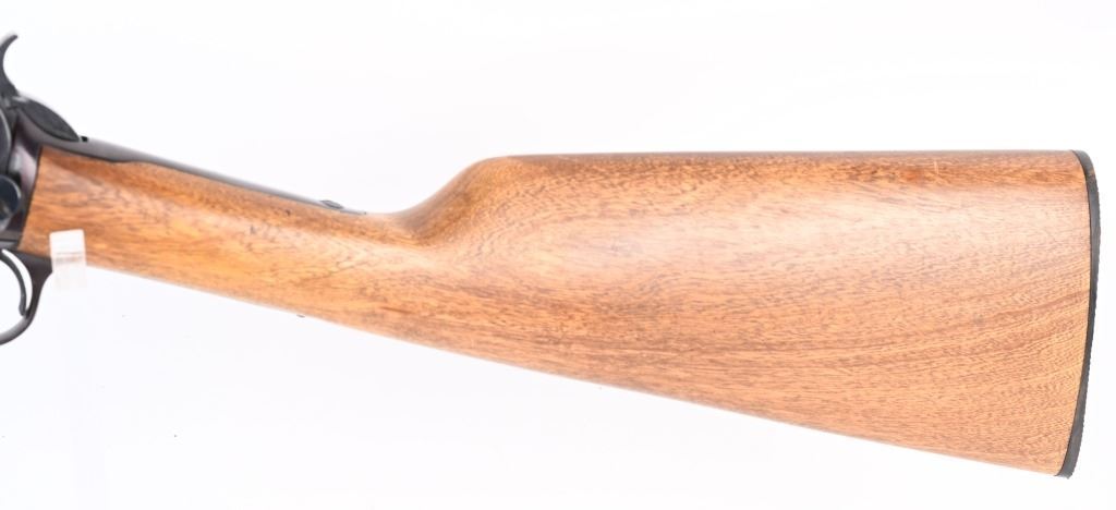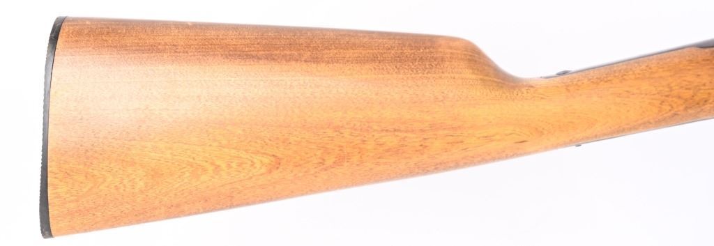 SERIAL NUMBER: G371946. BARREL: 23". CALIBER: .22 LR. MANUFACTURED: 1990's. Made in Brazil and imported by Interarms. Copy of the Winchester Model 1890. Takedown design. Blade front sight and u-notch rear leaf. Original blued finish and oiled wood furniture with a plastic butt plate. CONDITION: Metal is very good-excellent overall, with general wear. Wood has a few minor handling marks and scratches. Good bore with strong rifling. Mechanically fine. MODERN