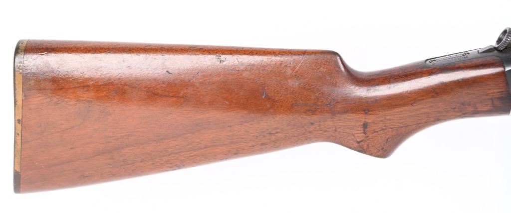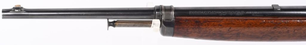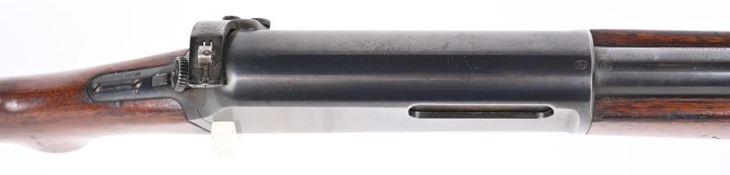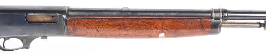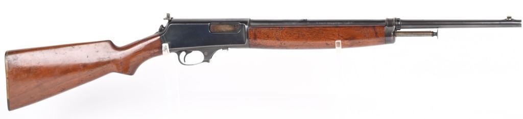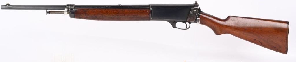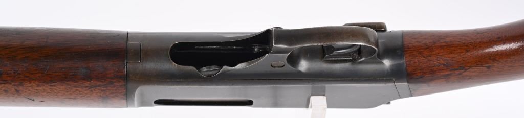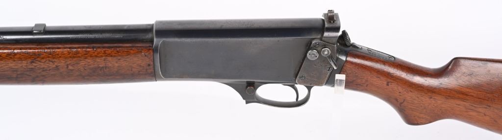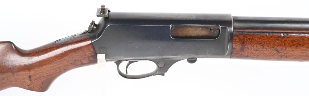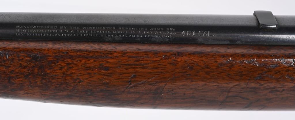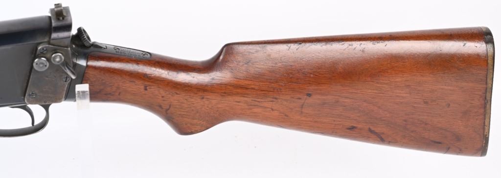 SERIAL NUMBER: 3048. BARREL: 20". CALIBER: .401 SELF LOADER. MANUFACTURED: 1911. Standard markings and features. Winchester proofs on the barrel and frame. Blade front sight and Lyman rear aperture sight. Original blue finish on the metal components. Oiled wood stock and forearm. Original checkered hard rubber butt pad. NO MAGAZINE. CONDITION: Metal is good overall, with general wear and scratches. Wood has numerous, dings and scratches. Butt plate is chipped at on the side. Bore is clean overall, with strong rifling retained. Mechanically fine. C&R