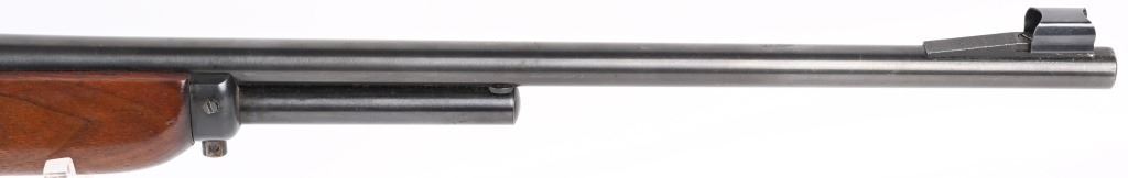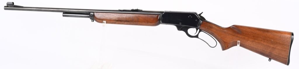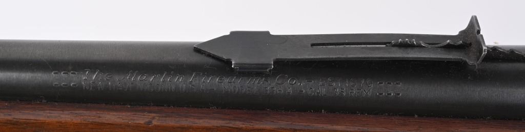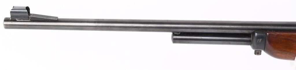 SERIAL NUMBER: J38135. BARREL: 24". CALIBER: .35 REM. MANUFACTURED: 1952. "JM" stamp on the right chamber. Half magazine tube. Hooded blade front sight and u-notch leaf rear. Original blued finish. Oiled wood furniture. Factory plastic butt plate. Added sling studs. Receiver is drilled for a scope mount. LOP is: 13-1/2". CONDITION: Metal is very good overall, with light wear. Wood has a few minor handling marks and scratches. Bore is clean overall, with strong rifling. Mechanically fine. C&R