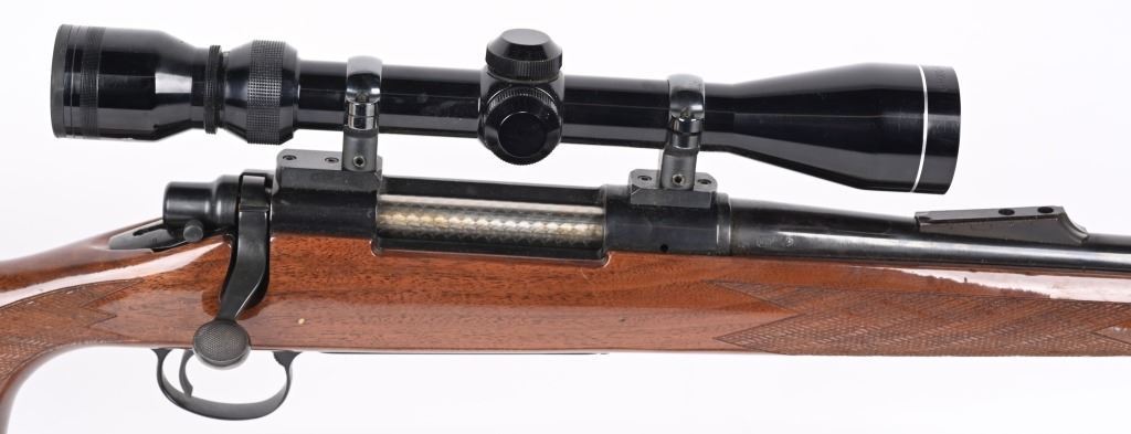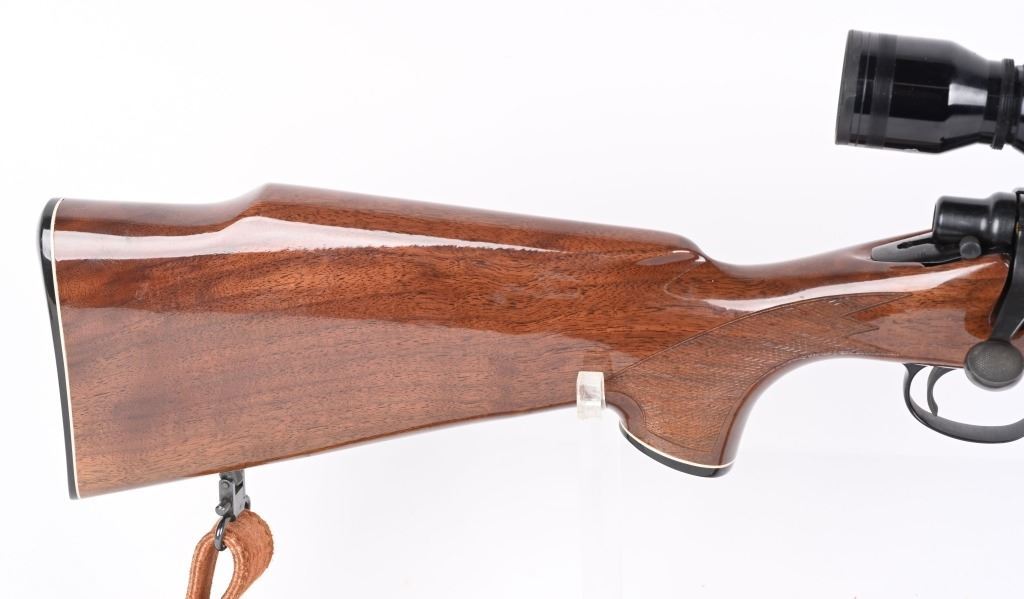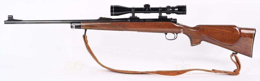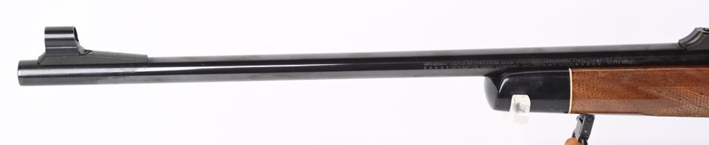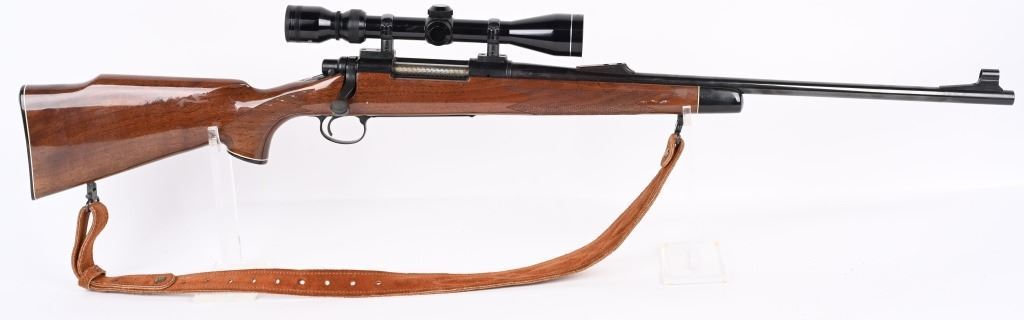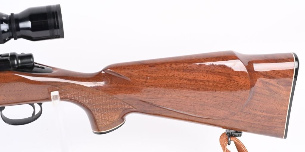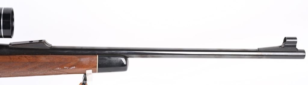 SERIAL NUMBER: B6896303. BARREL: 22". CALIBER: .270 WIN. MANUFACTURED: 1987. BDL model with trapdoor magazine. Factory hooded and ramped blade front sight. Rear sight base is present, but actual leaf is absent. Original blued finish and gloss wood stock with checkered butt plate. Fine checkering on the wrist and forearm. Includes attached leather sling and Tasco Pronghorn 3-9X40 Scope. LOP is: 13-1/2". CONDITION: Metal is excellent overall, with a few handling marks and scratches. Wood is excellent as well. Bore is clean with crisp rifling. Mechanically fine. Scope is clear. MODERN