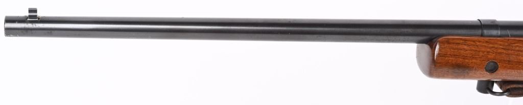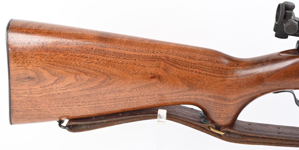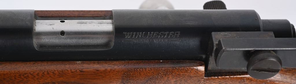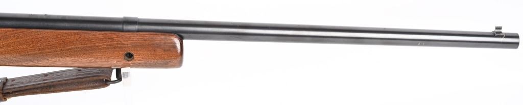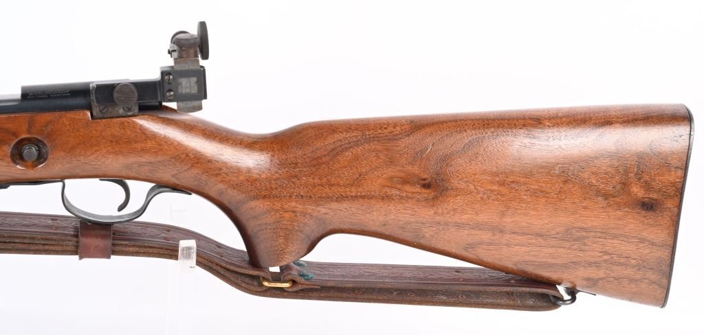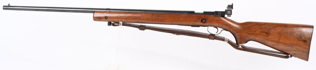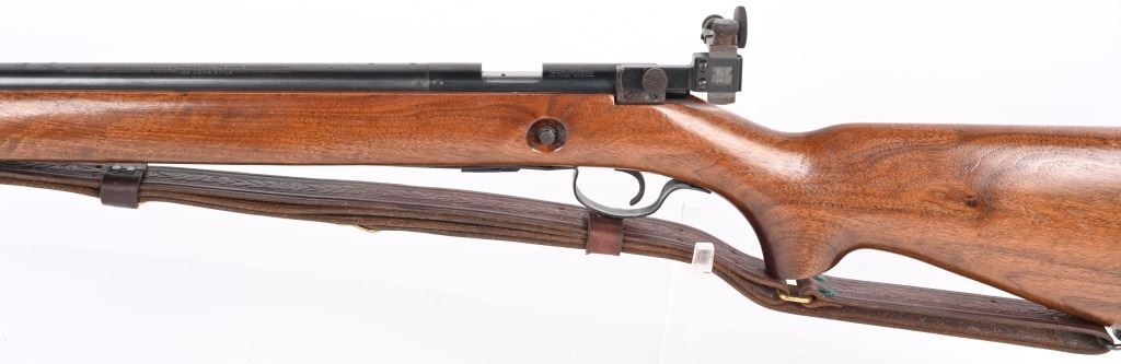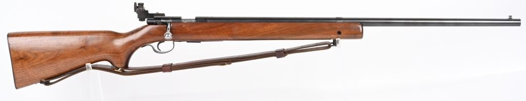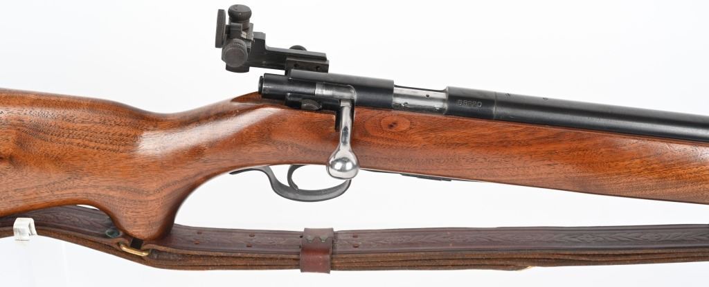 SERIAL NUMBER: 68220. BARREL: 28". CALIBER: .22LR. MANUFACTURED: 1949. Standard markings and features. Winchester proofs on the barrel and chamber. Blade front sight and Redfield peep sight. Original blued finish. Stock has been lightly sanded and oiled. Checkered metal butt plate. Original blued steel magazine. Includes attached, generic leather sling. LOP is: 13-1/2". CONDITION: Metal is very good overall, with minor handling marks and scratches. Wood has a few handling marks and scratches. Bore is shiny with crisp rifling. Action may need minor adjustment, as when on safe and the trigger is pulled, the firing pin engages when the safety is turned to fire. Trigger guard is dented in, around the magazine area. Magazine has light finish wear. Sling is excellent. C&R