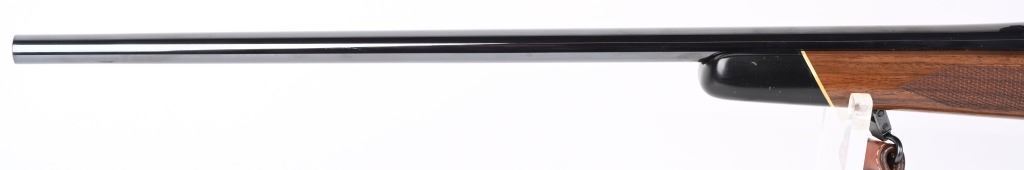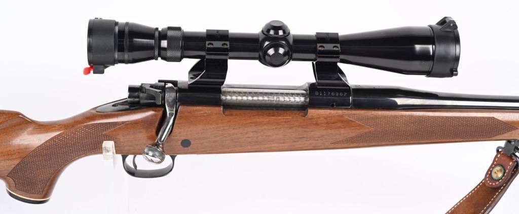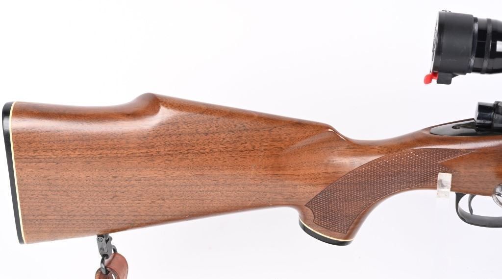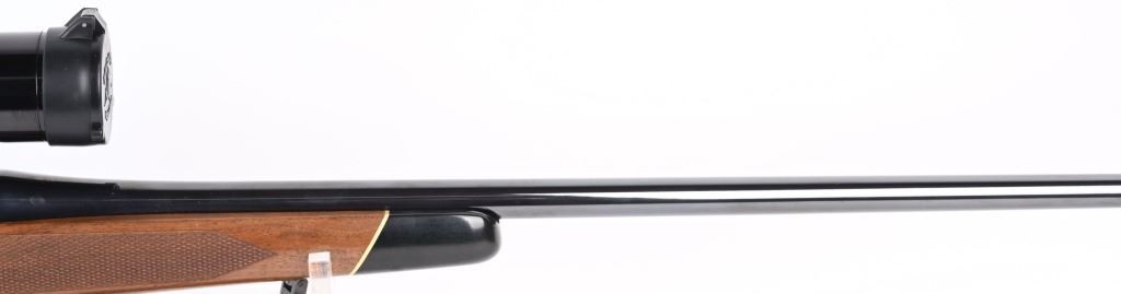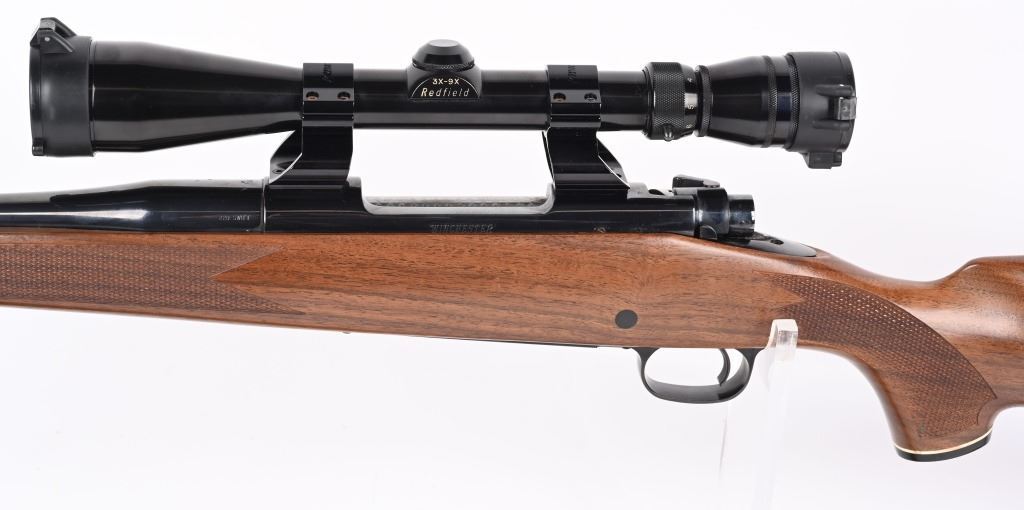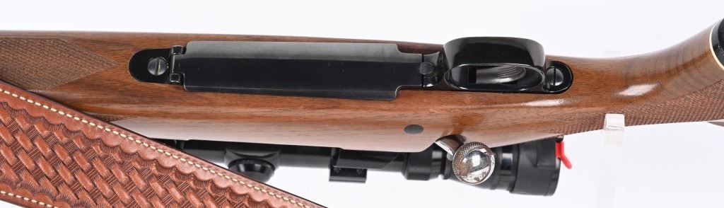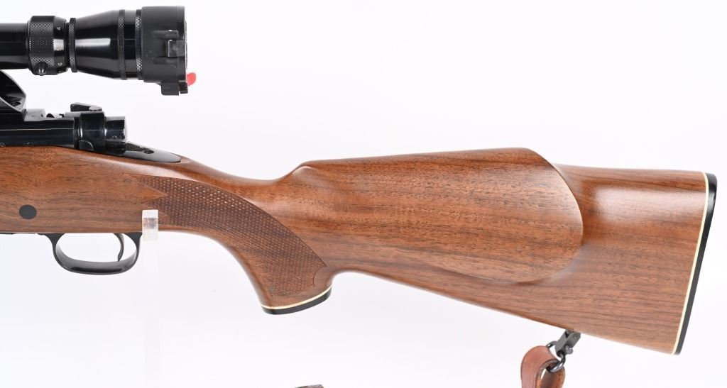 SERIAL NUMBER: G1176962. BARREL: 24". CALIBER: .220 SWIFT. MANUFACTURED: 1980'S. Standard weight barrel, with no iron sights added. Original blued finish and oiled wood stock, with checkering on the wrist and forearm. Checkered plastic butt plate. Includes attached Redfield 3x-9X scope and leather sling. LOP is: 13-3/4". CONDITION: Metal is very good overall, with a few handling marks. There is some light surface rust around the action area. Wood is excellent as well. Bore is clean with crisp rifling. Scope is excellent, with a clear optic. MODERN