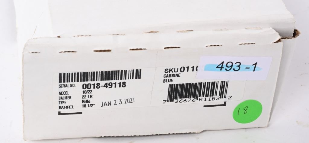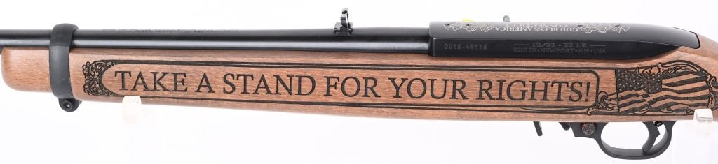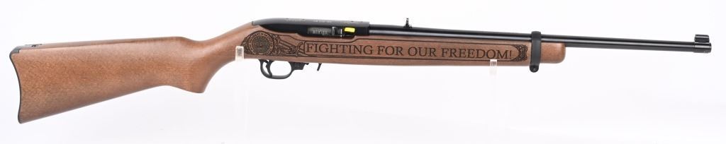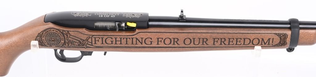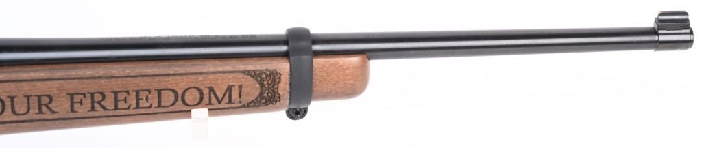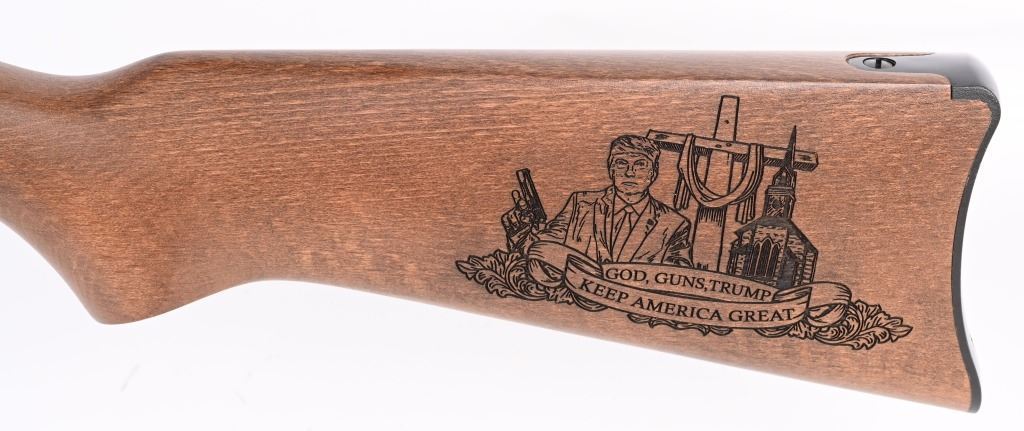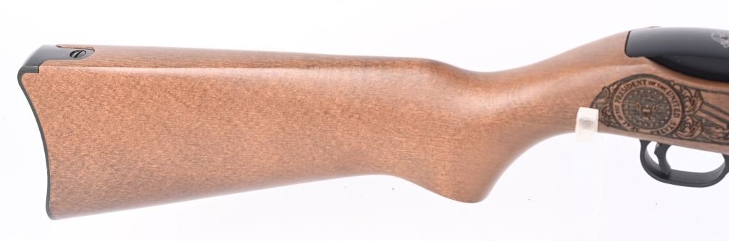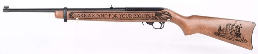 SERIAL NUMBER: 0018-49118. BARREL: 18-1/2". CALIBER: .22LR. MANUFACTURED: 2021. 45 rifles were made per state, to celebrate the Trump presidency. Laser engraved on the top of the frame. Laser cut stock art as well. Standard factory sights, blued finish and oiled wood stock. Includes factory 10rd magazine, box, lock, manual and scope mount. CONDITION: Excellent overall, with little signs of handling. Bore is shiny with crisp rifling. Looks to be unfired from the factory. Mechanically fine. Box is excellent. MODERN