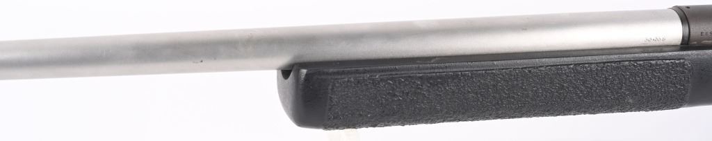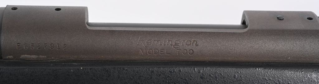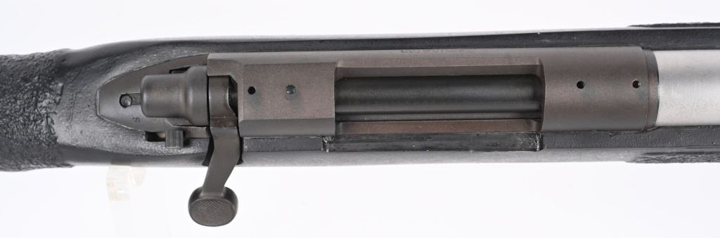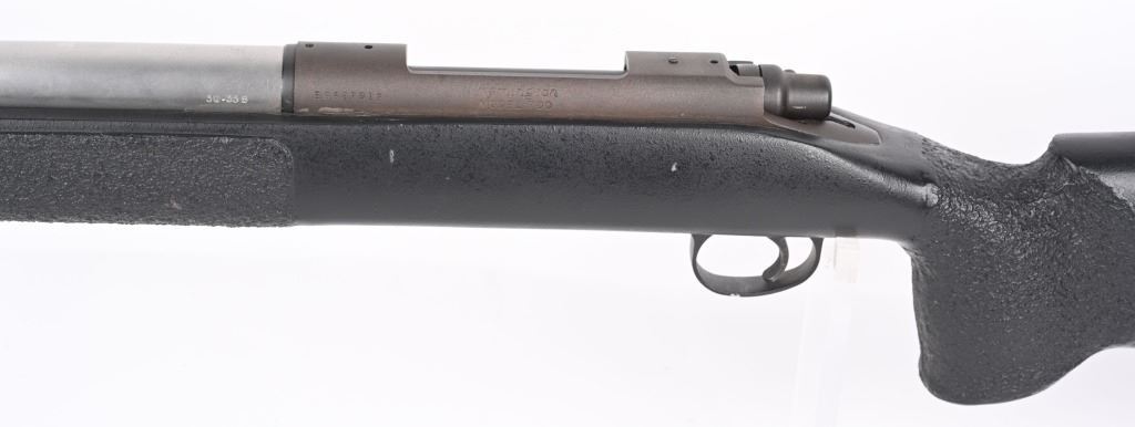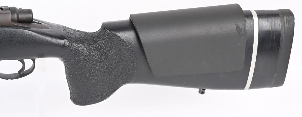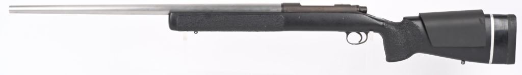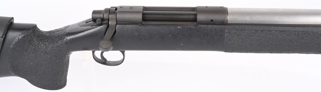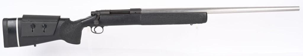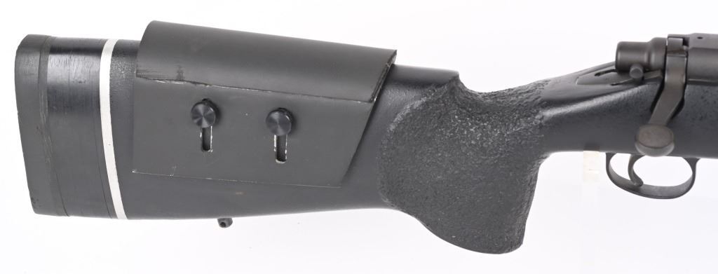 SERIAL NUMBER: E6527912. BARREL: 26". CALIBER: .338 WIN MAG. MANUFACTURED: 1990'S. Remington 700 action with an unknown custom stainless heavy barrel. Caliber is marked "30.338". A chamber cast should be performed by the user to get exact cartridge dimensions. Receiver is drilled and tapped for a scope mount, and has a matte finished. Action is glass bedded in a custom synthetic stock. Adjustable cheek piece. Thick butt pad with spacers. CONDITION: Metal is very good overall, with light wear. Stock ha s few minor dents and scratches. Bore is shiny with crisp rifling. Mechanically fine. MODERN