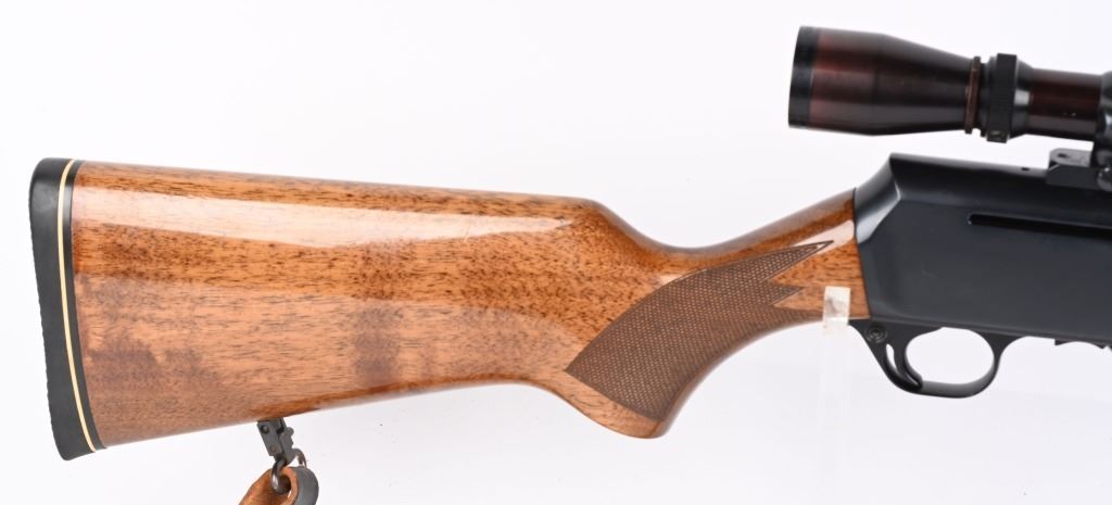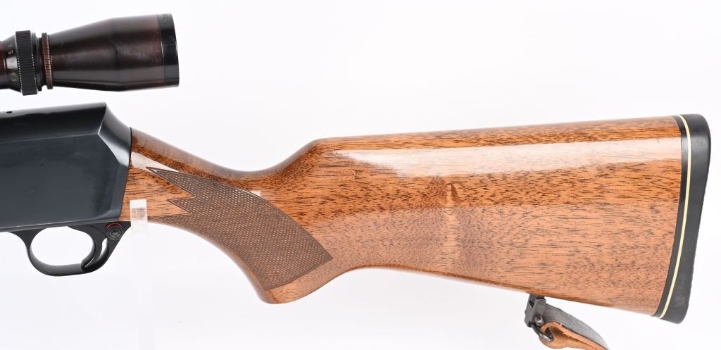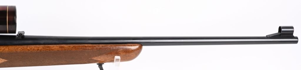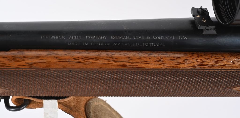 SERIAL NUMBER: 57018M77. BARREL: 24". CALIBER: 7MM REM MAG. MANUFACTURED: 1977. Belgian made components, being assembled in Portugal. Factory ramped blade front sight and flip up u-notch rear. Factory blued finish and gloss finished wood stock. Fine checkering on the wrist and forearm. Factory black rubber butt pad. Added generic leather sling. Redfield mount and Leupold 3X9 VARI-X II scope. Magazine body and spring are absent. Follower and spring are absent. CONDITION: Metal is very good overall, as is the wood, both having a few light handling marks. Bore is clean overall with crisp rifling. Mechanically fine. Scope has exterior wear, and is turning a plum patina color. Optic is clear. Cap is missing from the elevation adjustment screw. MODERN