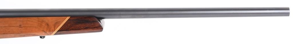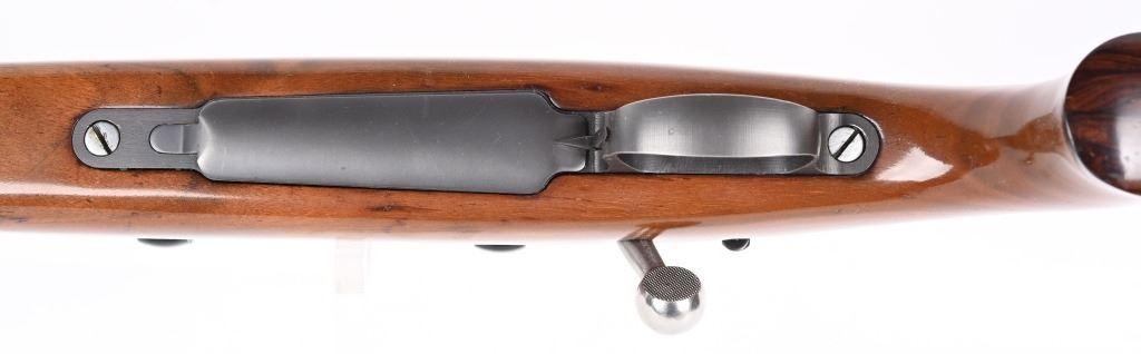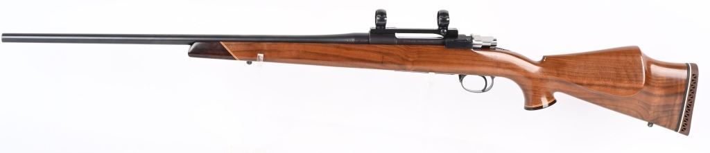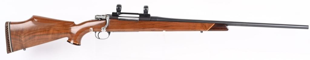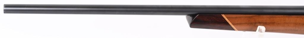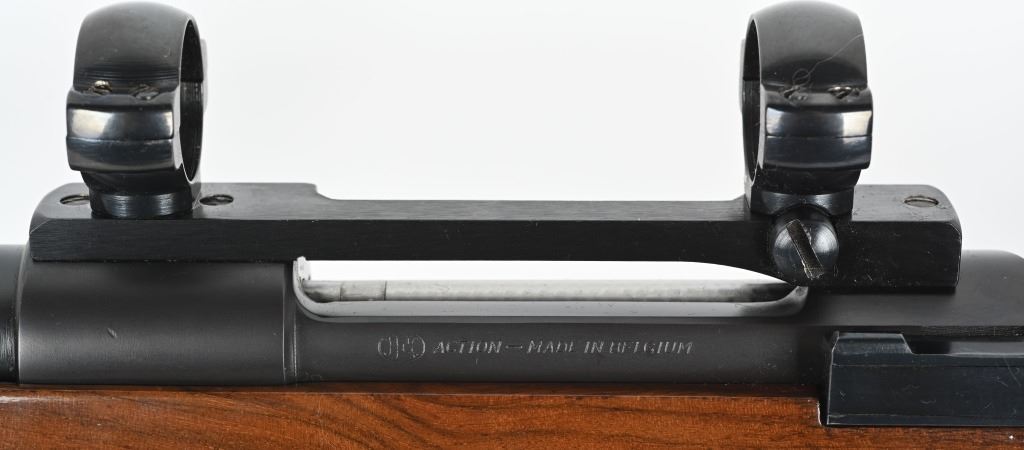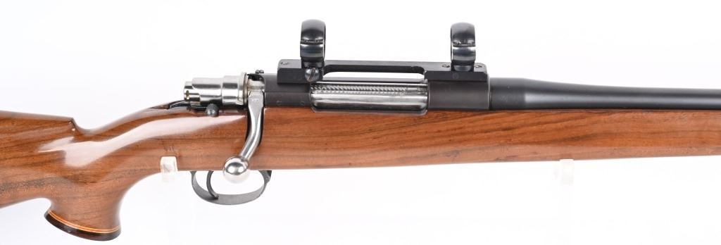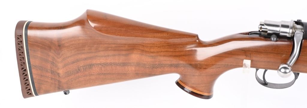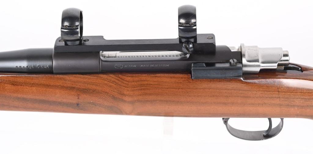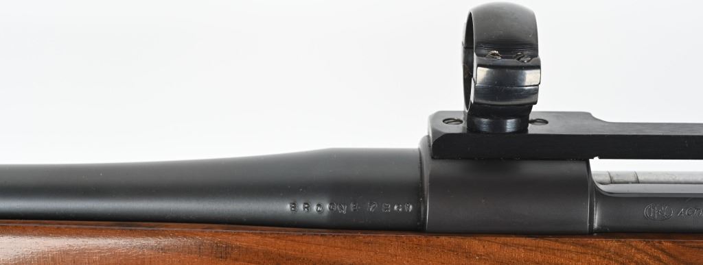 SERIAL NUMBER NSN. BARREL24" CALIBER 7X61. Custom rifle using an FN Mauser action. Barrel is stamped Brogne. Barrel was made sans sights and has a base with rings for scope. Non checkered deluxe walnut stock, Monte Carlo comb, contrasting fore-end tip and grip cap with waffle pad and sling eyes. Ralph Brogne was a gunsmith in New Philadelphia, Ohio. Condition. Near mint as built with light high edge and muzzle wear. Stock has a few impressions. C&R