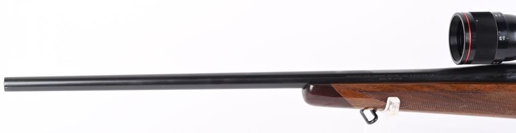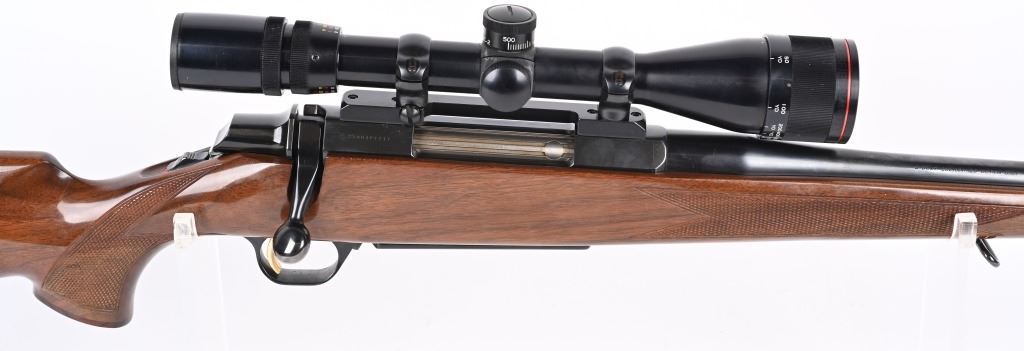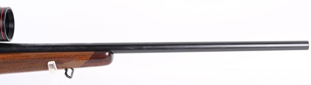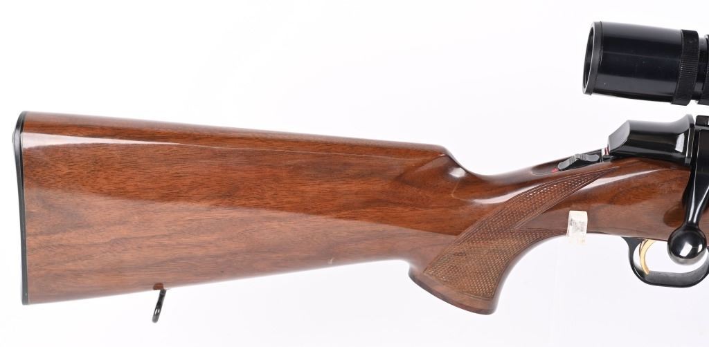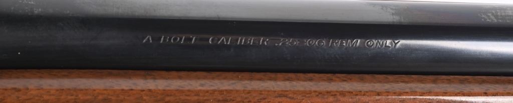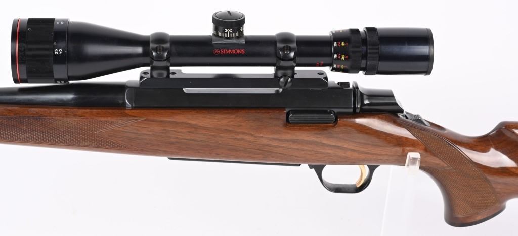 SERIAL 25004PT217. BARREL 22". CALIBER 25-06. Features blue finish, barrel not fitted for sights, high gloss pistol grip checkered walnut stock with straight comb and sling swivels. Comes with Simmons scope that has clear standard cross hair reticle. Condition. Near mint with light handling. MODERN