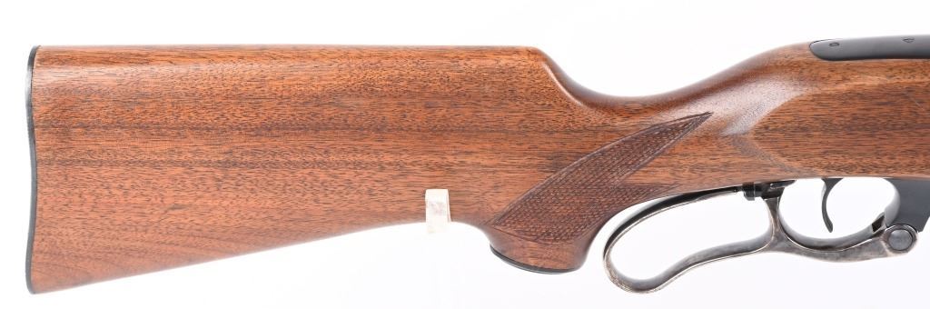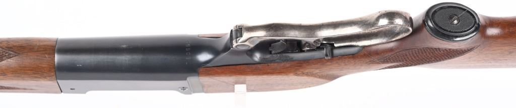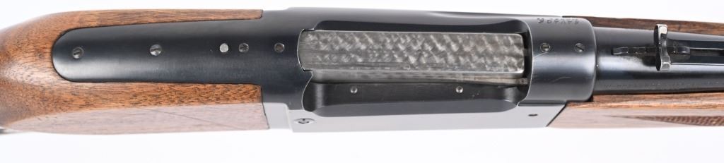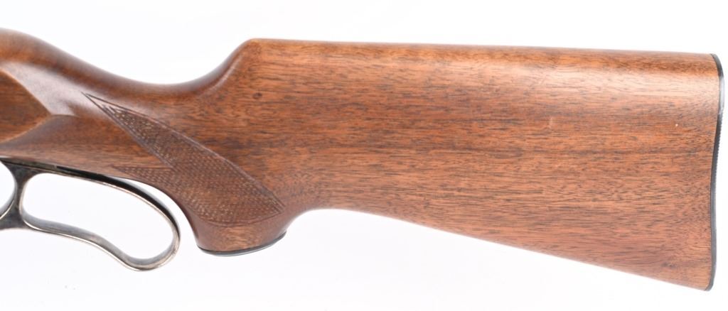 SERIAL 780950. BARREL 22". CALIBER .300 SAVAGE. MADE IN 1956. Solid frame, jeweled bolt, blue finish, ramp front sight, semi buckhorn rear sight, checkered walnut stock, grip cap, steel butt plate. Condition. Still retains case color on sides of lever. Solid 98-99% blue finish, Stocks are excellent with sharp as new checkering with few handling marks and impressions. Bore is bright. C&R