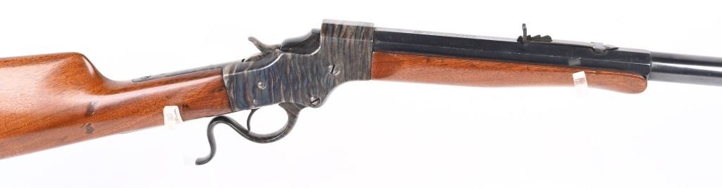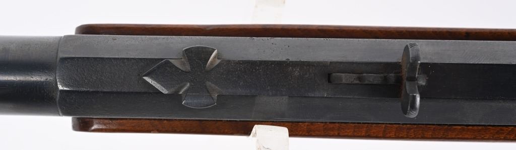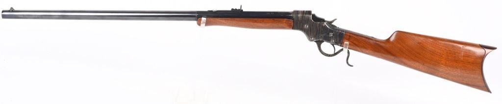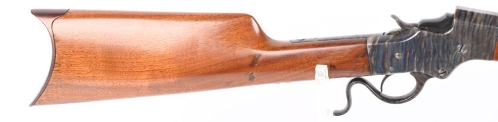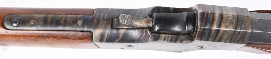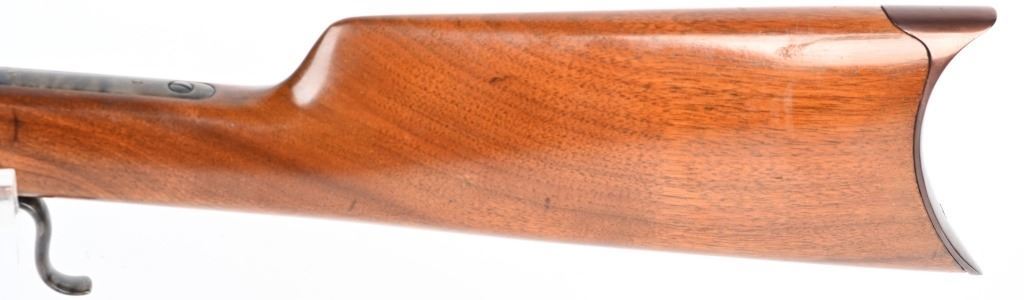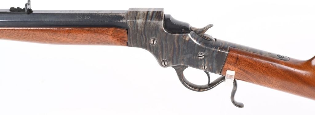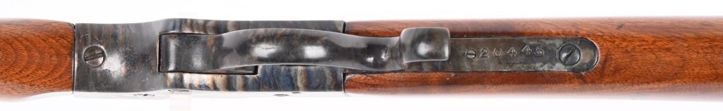 SERIAL 20445. BARREL 26". CALIBER 25-20 CF. Features half octagon blue barrel, case color frame & lever, walnut stock with rifle butt plate, Semi buckhorn rear sight. Condition. Completely restored colors, blue and wood. retains 95% with some roughness at breech. Bore is strong. C&R
