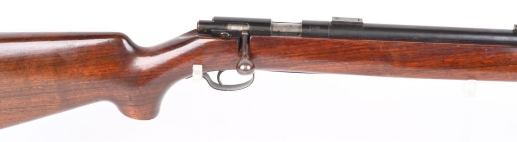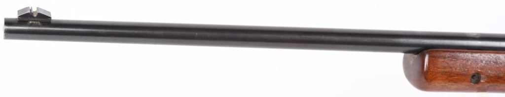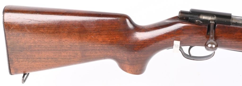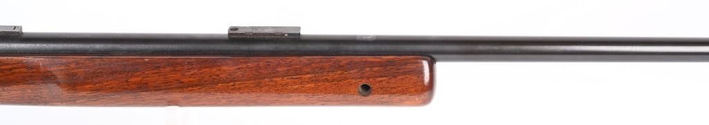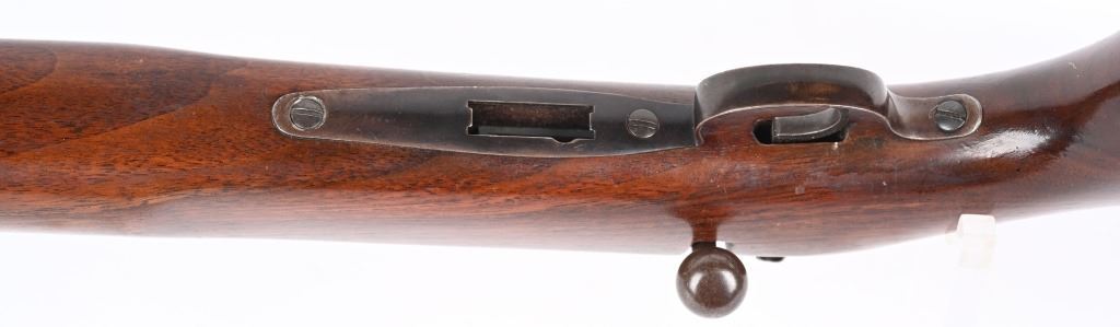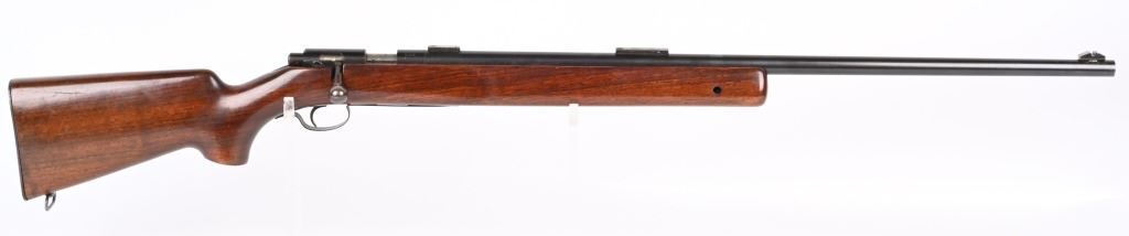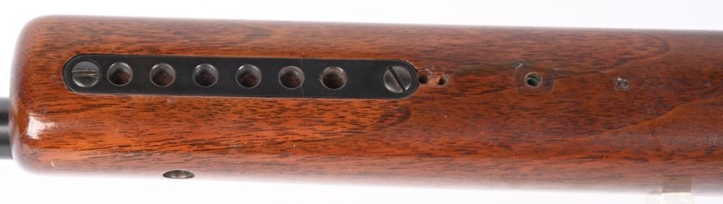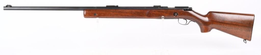 SERIAL 1336. BARREL 28". CALIBER 22LR. MADE IN 1939. Quality bolt action, magazine fed (missing) , heavy barrel, no sights, blue finish, plain pistol grip walnut stock. Barrel has scope blocks and front sight block has no blade Side of barrel has two tap holes for sight. Condition. 95% blue with handling wear. Stock is excellent. The front sling hole is empty and missing band. Bore is crisp, but dulling. C&R