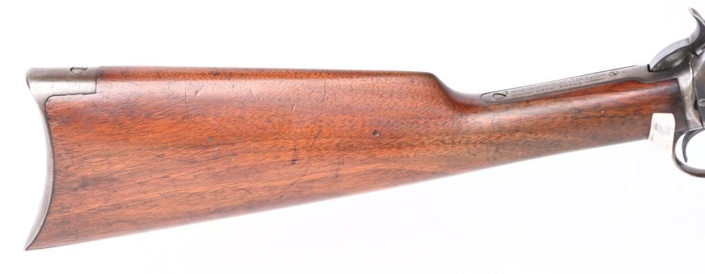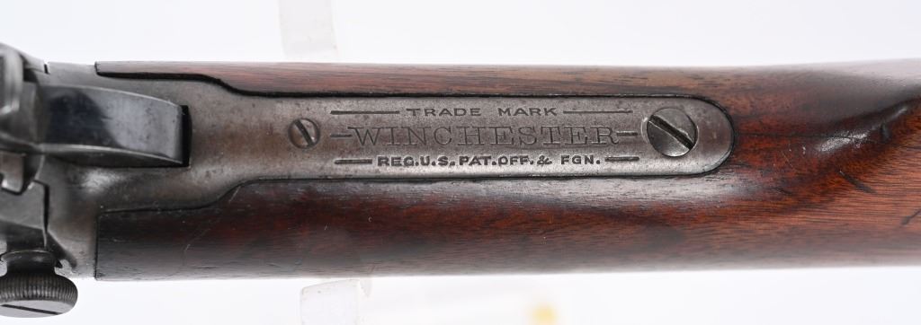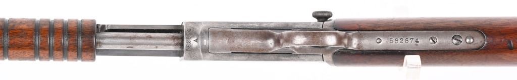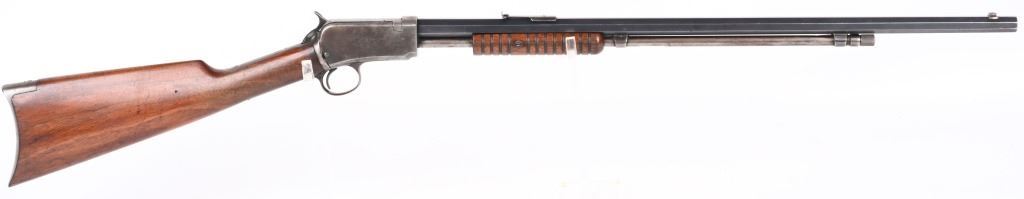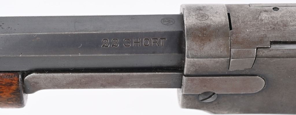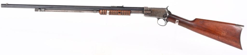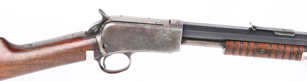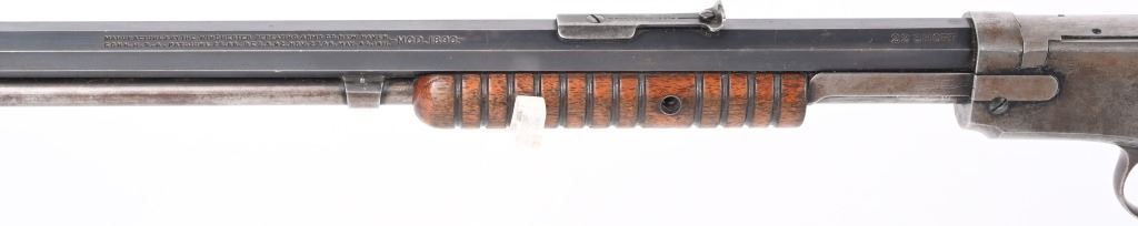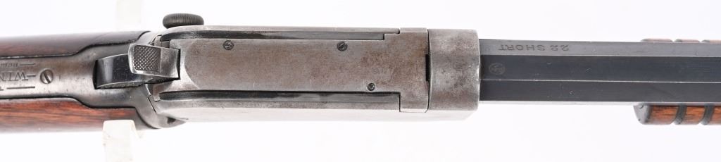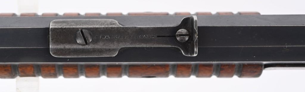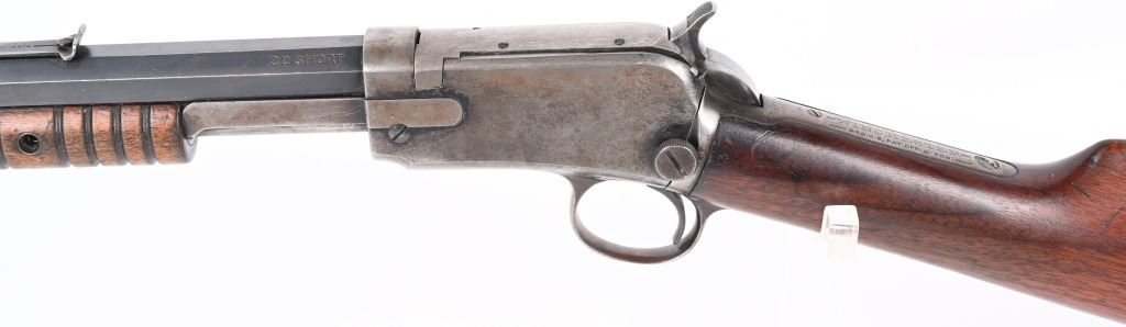 SERIAL 582674. BARREL 24". CALIBER 22 SHORT. MADE IN 1917. Features full octagon barrel, 2/3 tube magazine, 1901 patent rear sight, take down, walnut stock with rifle butt plate, grooved fore-arm missing left screw. Condition. Barrel retains 90% plus blue with light high edge wear and bold legends. Frame is basically dull gray. Stocks are proud to metal and in excellent condition. Bore is strong but frosted. C&R