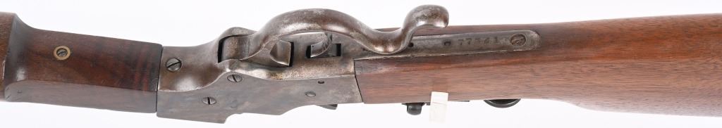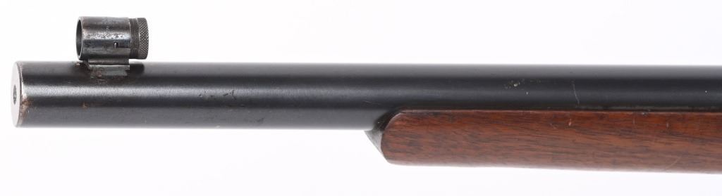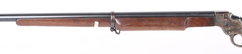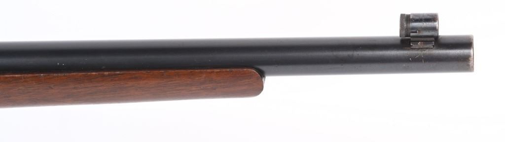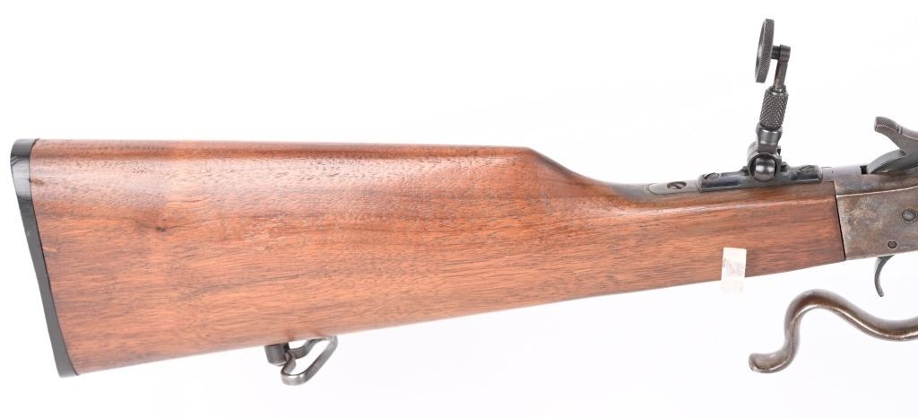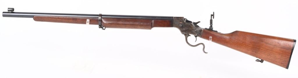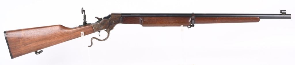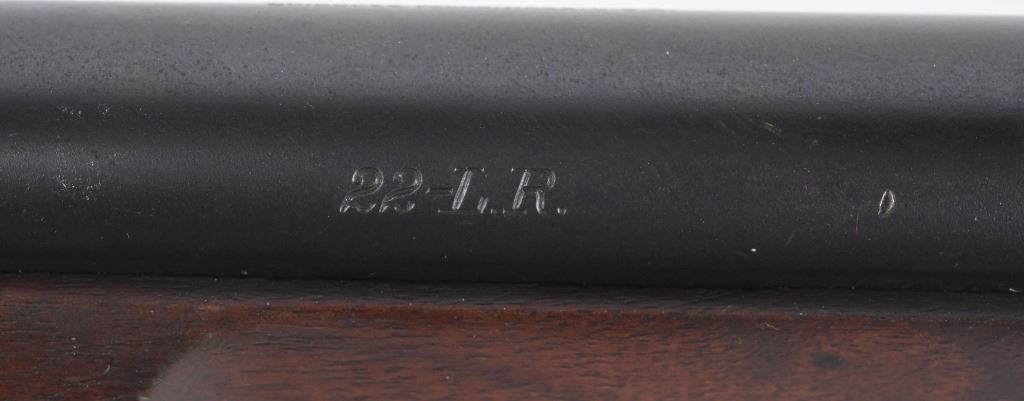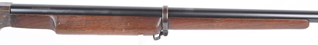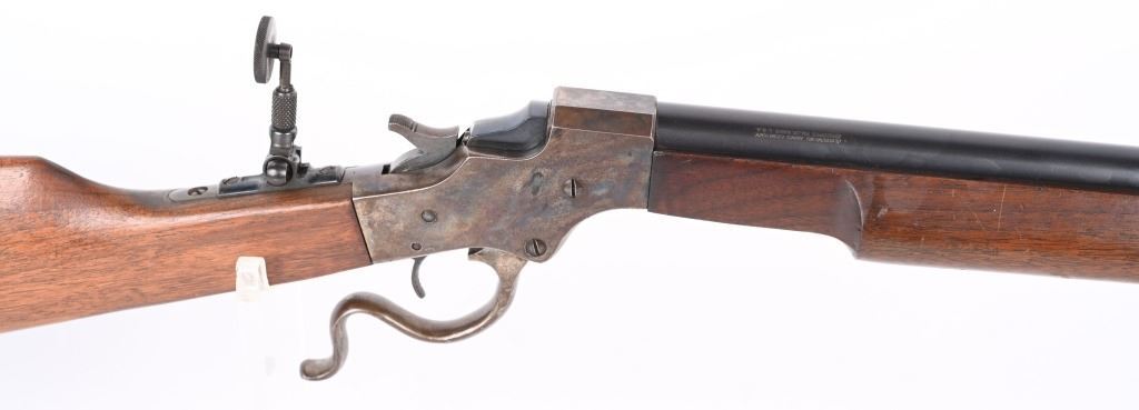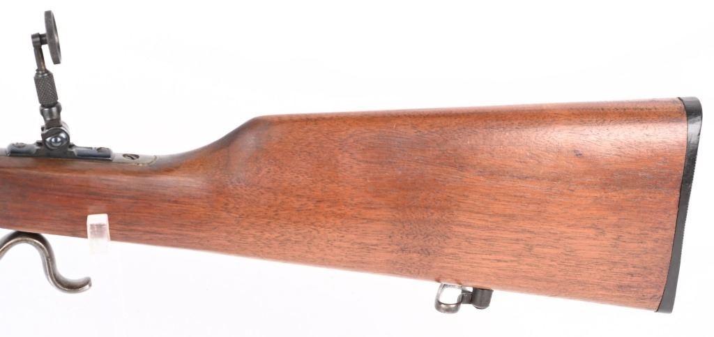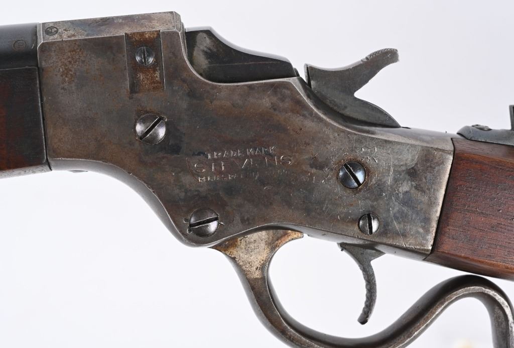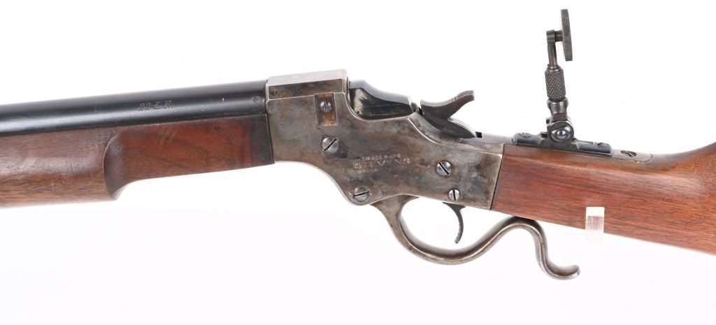 SERIAL 77361. BARREL 26". CALIBER 22LR. Stevens manufactured this falling block rifle for 24 years, from 1908 to 1932. Military style walnut stock, heavy round barrel, case color falling block action, single barrel band, globe front sight. A tang sight replaced the factory side mount peep sight. Also comes with sling swivels. Condition. Fine with 90% blue on barrel, 60% plus case colors, excellent wood, black plastic butt plate. Bore is excellent. C&R
