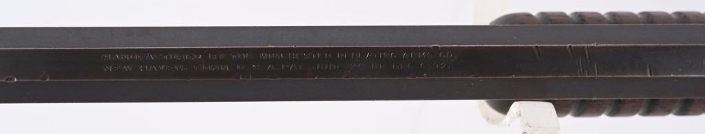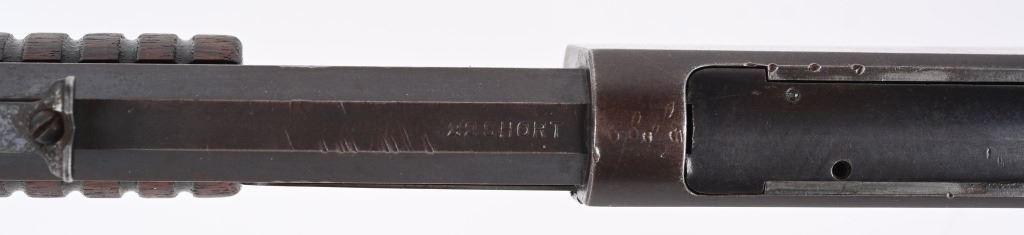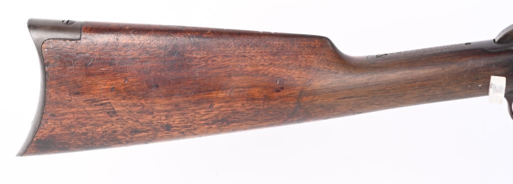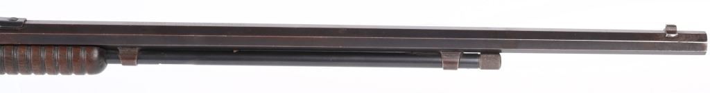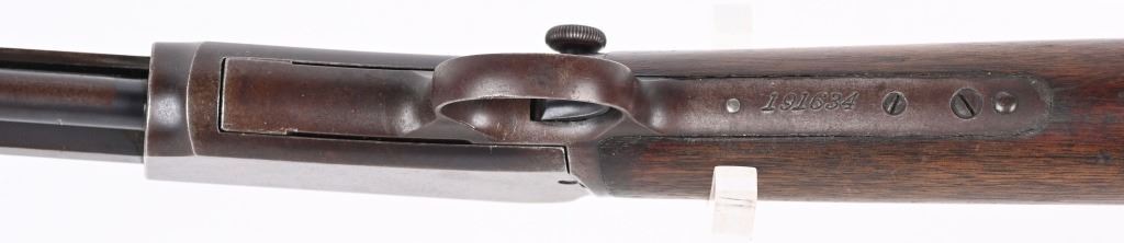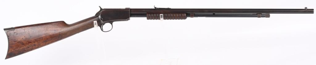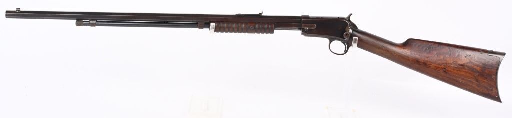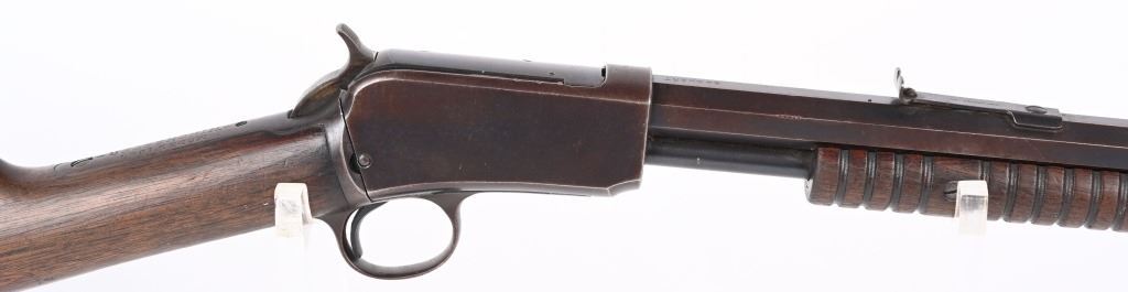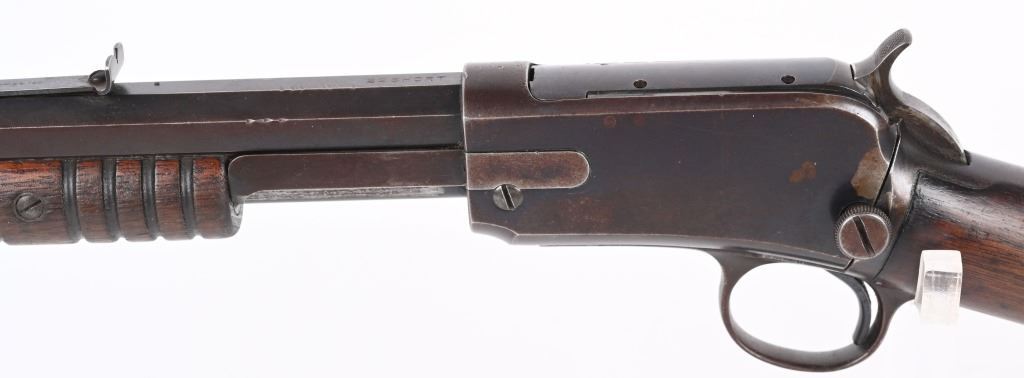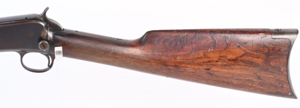 SERIAL 191634. BARREL 24". CALIBER 22 SHORT. MADE IN 1904. Features full octagon barrel, 2/3 tube magazine, take down, blue finish, 1901 patent rear sight, walnut stock, grooved fore-arm, rifle butt plate. Condition. Fine. 85-90% blue on barrel and tube drifting with plum. Frame retains about the same type three finish with light age freckling. Bore is strong but frosted. Wood very good with usual dents and abrasions but proud to metal. Far above average. C&R