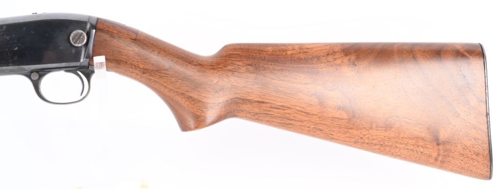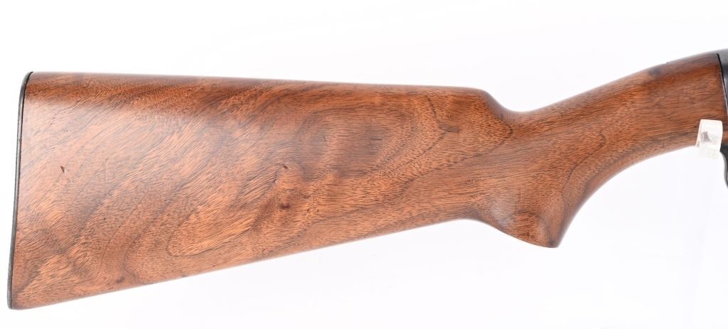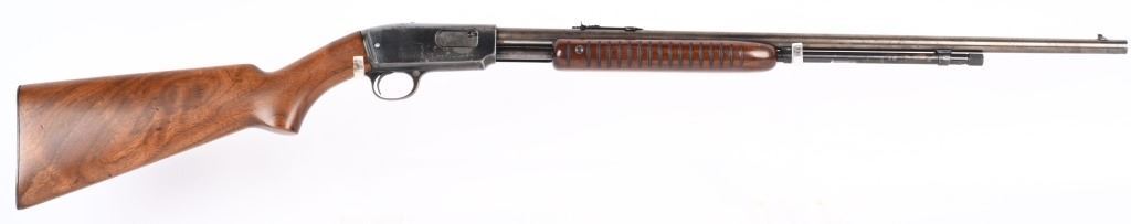 SERIAL NUMBER: 76421. BARREL: 24". CALIBER: .22 S L LR. MANUFACTURED: 1946. Standard takedown model with company markings on the barrel. Winchester proofs present as well. Blade front sight, with factory u-notch rear. Period re-applied blued finish. Three extra holes drilled in the frame. Stock and forearm have been lightly refinished. Checkered metal butt plate. CONDITION: Metal is good overall, with finish loss, mainly on top of the barrel/action. Wood has minor scrapes, scratches and dents. Bore is shiny with strong rifling retained. Mechanically good. C&R