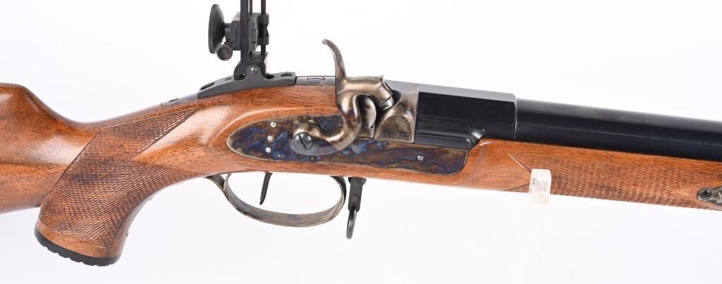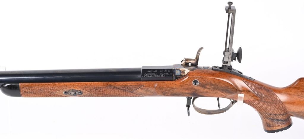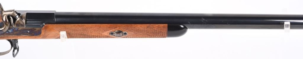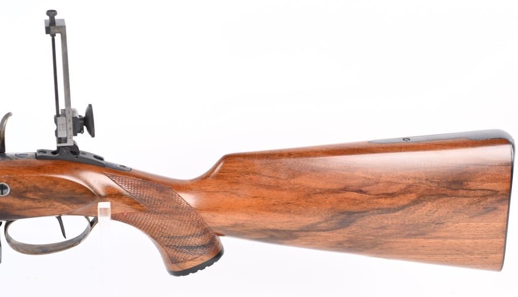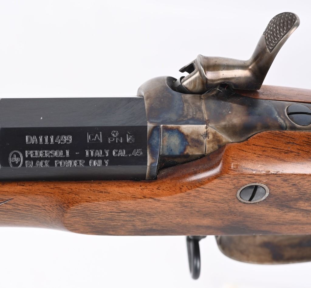Pedersoli Gibbs Muzzleloading Rifle 45 Caliber Percussion 36" Blued Barrel Walnut Stock, hand checkered pistol grip with black cap and fore-end tip. Beautiful oil finish extra grain fancy walnut stock. Heavy full round high polish royal blue finish with Spirit level front sight and long range tang sight with no provision for rear barrel sporting sight. Blued steel shotgun butt plate. Frame, hammer and trigger guard are case colored. Comes with single sling swivel at guard for off hand shooting. Gun is as new with light handling. BLACKPOWDER