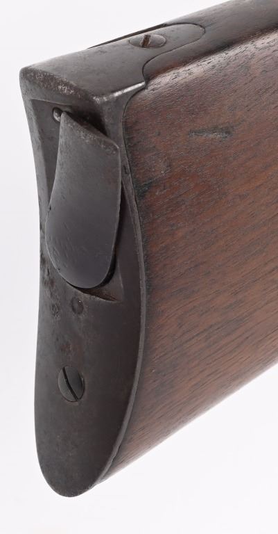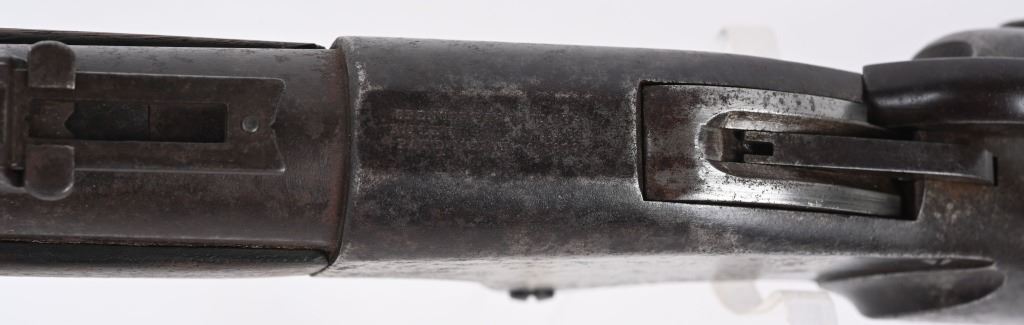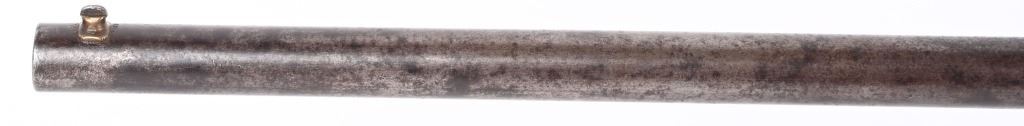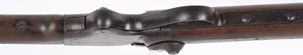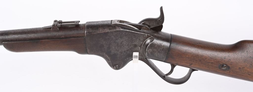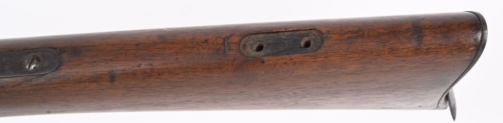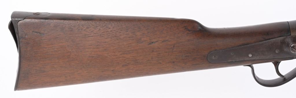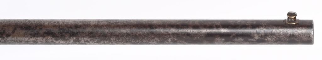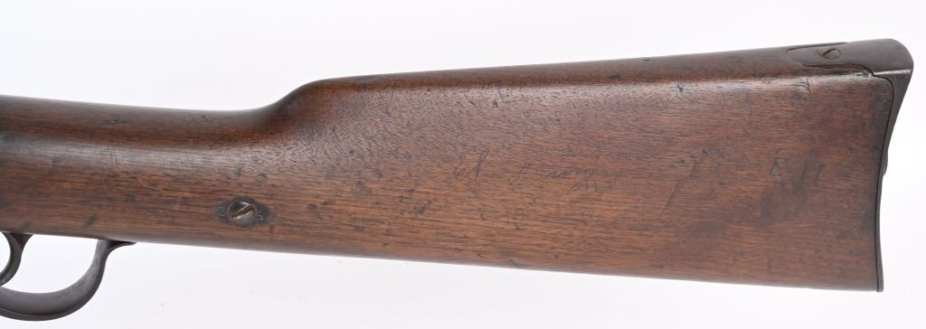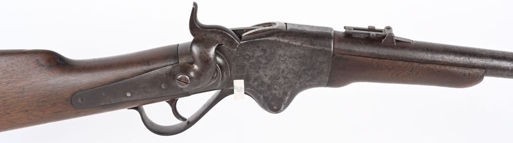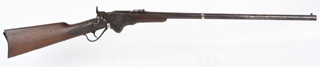 SERIAL 1953. BARREL 28 1/4". 56-56 SPENCER. Barrel and fore-end have been shortened from a standard military rifle. Front sight is period hand made. Walnut stock has a missing sling swivel. Standard Spencer rear folding sight, rear loading tube. Condition. Freckled soft brown patina with no original finish. Stock is excellent with usual impressions. Bore is sharp but does have some roughness. ANTIQUE