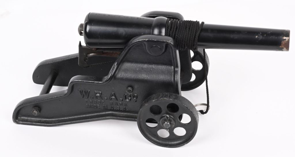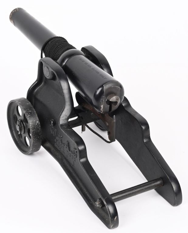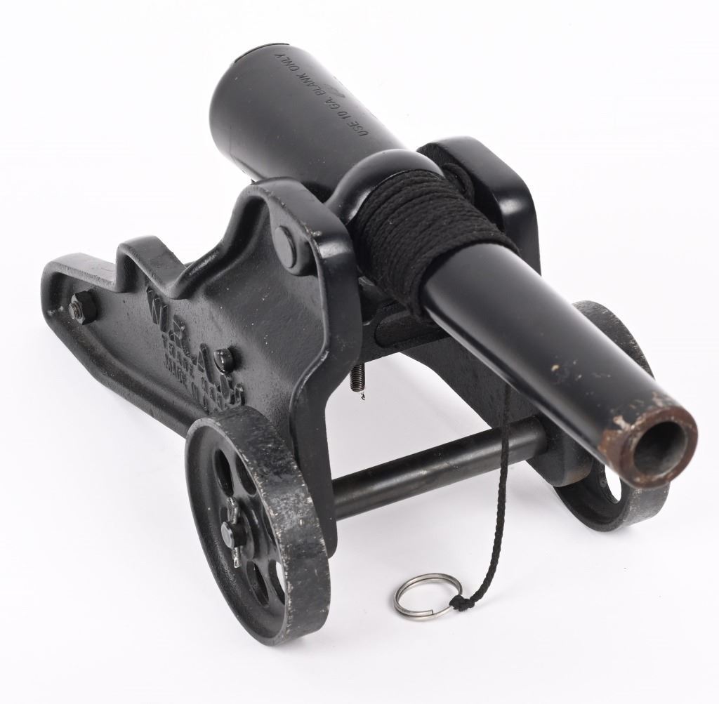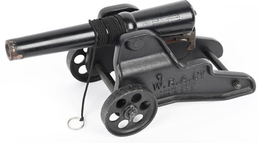 Both sides of carriage are marked "W.R.A. Co./TRADE MARK/REGISTERED IN U.S.A.. Top stamped USE 10 GA. BLANKS ONLY. Three line Winchester stamp on sides of barrel All metal construction and painted black. Barrel measures 12" and stands about 7" tall. This type was first introduced in 1903. There is some finish wear at muzzle and on wheels but still a solid 90%. BLACKPOWDER
