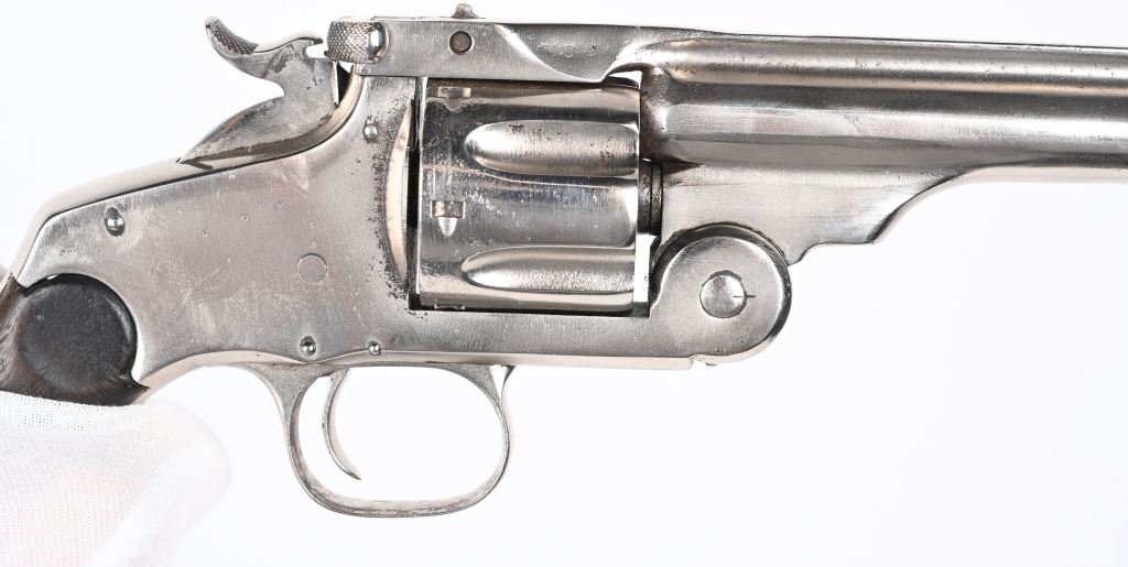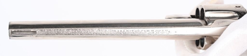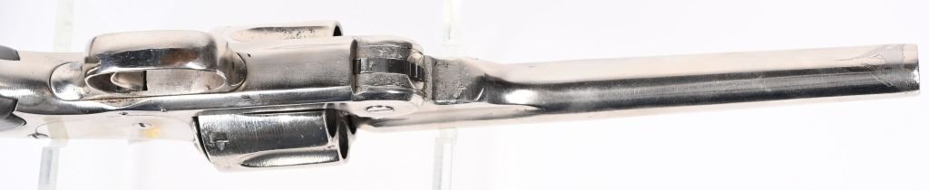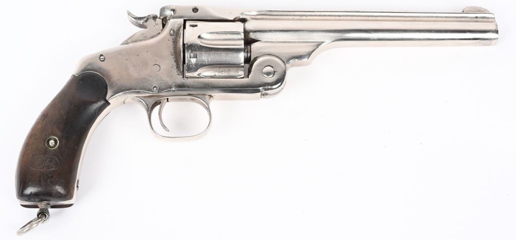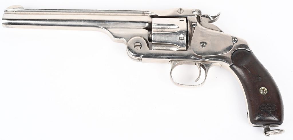 SERIAL 7340. BARREL 6.5". CALIBER 44 RUSSIAN. Total of 280 made for the State of Maryland, US military purchase. Walnut grips are stamped "DAL 1878" on left panel while right panel has sub inspector cartouche. Back of cylinder stamped with serial number and HN for Henry Nettleton. Matching number on barrel. Faint US on butt and serial number partially visible but not readable under lanyard. Gun has been completely re-nickel plated. The barrel address is visible but only partially readable with some pitting under nickel. Gun indexes and locks up. Rifling is decent with some abrasion. Grips are excellent . Antique
