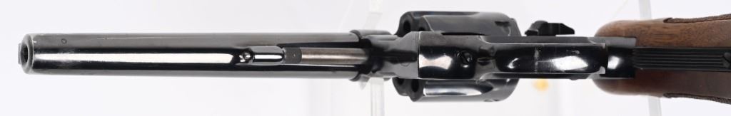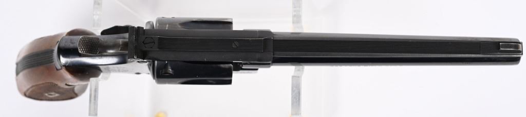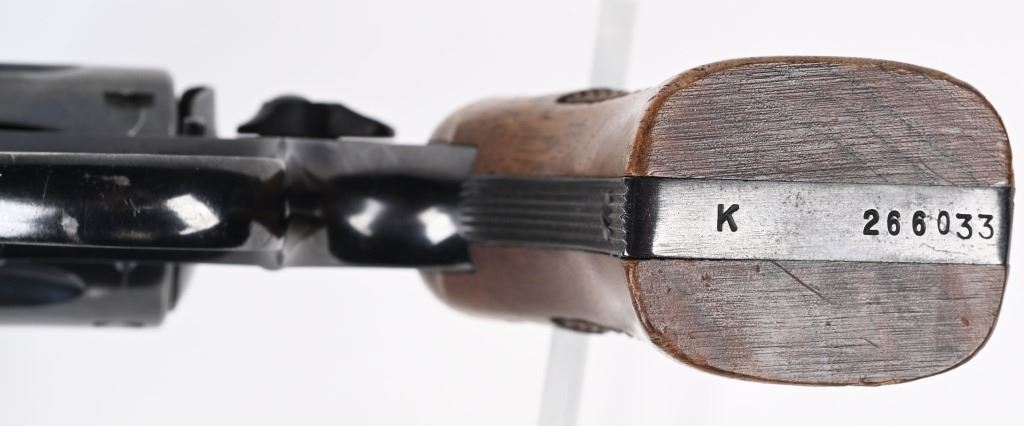 SERIAL NUMBER: K266033. BARREL: 6". CALIBER: .22LR. MANUFACTURED: 1950'S. Standard markings and features. Matching serials on the cylinder, barrel and butt. Six shot fluted cylinder. Pinned barrel with blade front sight and adjustable u-notch rear. Original blued finish and case colored serrated trigger/spurred hammer. Factory checkered magna wood grips. CONDITION: Metal is good overall, with light scratches and handling marks. Grips have minor impressions and dents. Bore is clean overall with crisp rifling. Sharp mechanics. C&R