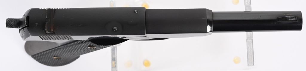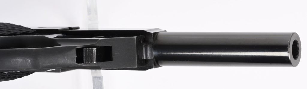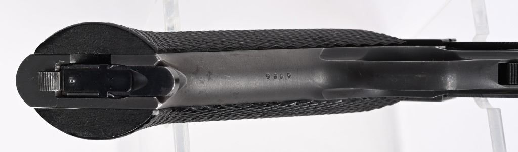 SERIAL NUMBER: 6886. BARREL: 5". CALIBER: .380 ACP. MANUFACTURED: 1940'S. Blade front sight and u-notch rear. Factory blued finish and checkered plastic grips. Includes factory two tone blued steel magazine. CONDITION: Metal is very good overall, with light wear and scratches. Grips are excellent. Bore is shiny with crisp rifling. Fine mechanics. Magazine has light finish wear. C&R