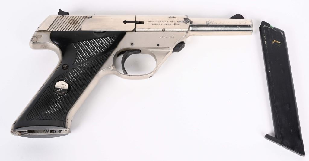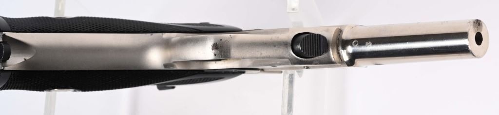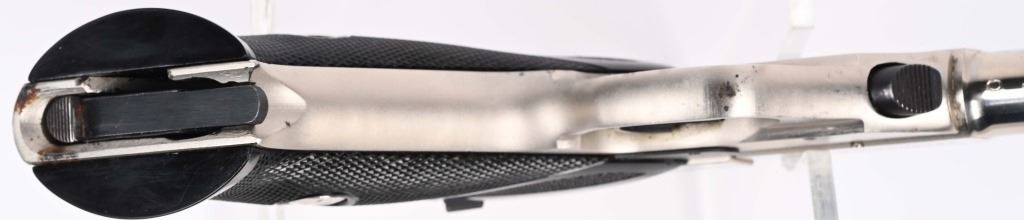 SERIAL NUMBER: 2428197. BARREL: 4-1/2". CALIBER: .22LR. MANUFACTURED: 1974. Standard factory markings and features. Blade front sight and u-notch rear. Factory nickel finish and checkered black plastic grips. Factory blued steel magazine. CONDITION: Metal is good overall, with light wear. There are a few minor splotches of surface rust throughout. Grips are excellent. Bore is shiny with crisp rifling. Magazine is excellent. MODERN