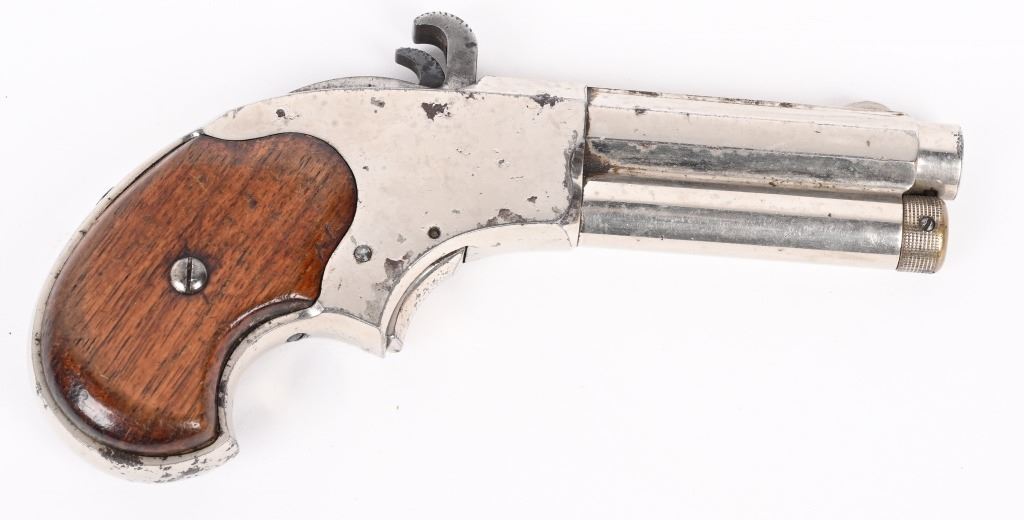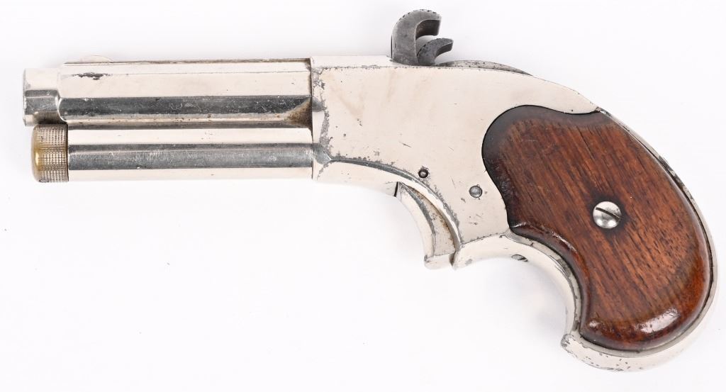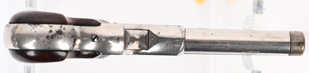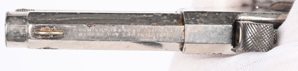 SERIAL NUMBER N/A BARREL 3" CALIBER .32 EXTRA SHORT RIM FIRE MANUFACTURED 1871-88. Unique 5 shot tubular magazine fed single action pistol. Nickel finished with smooth varnished walnut grips. 2 line Remington address on top rib. Rarely encountered in a non-engraved specimen. CONDITION, Very fine with over 97% nickel finish remaining with excellent bore and properly operating action. Grips are very fine. ANTIQUE