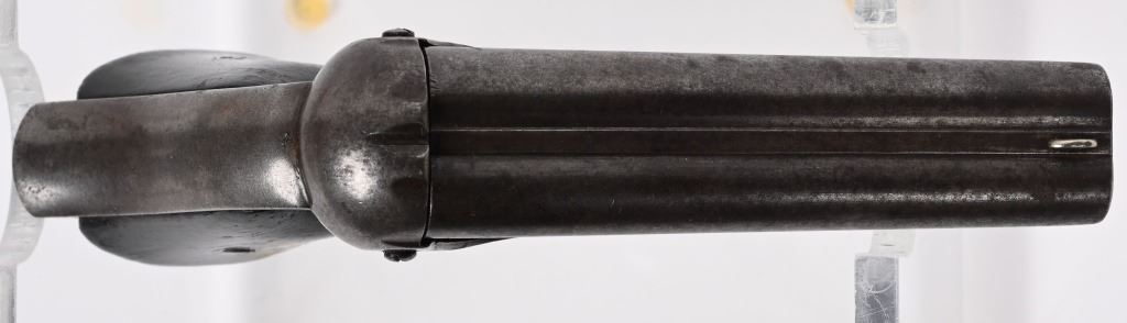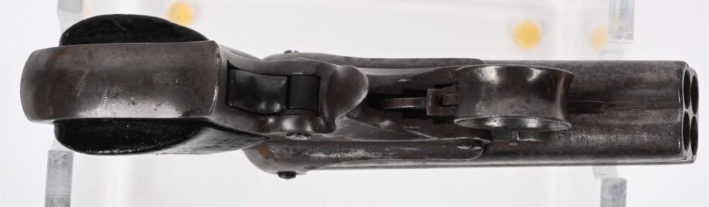 SERIAL NUMBER 19292 BARREL 3 3/8" CALIBER 32 RIM FIRE MANUFACTURED 1863-88. 4 barrel 32 rimfire pepper box with ring trigger, blue finish and 2 piece varnished walnut grips. The 4 barrel cluster remains stationary while a rotating firing pin struck the individual chambers in a double action operation. CONDITION: Fair, pistol is a mottled patina finish with full sized grips. Bores are dark. Action fails to operate and needs adjustment. ANTIQUE