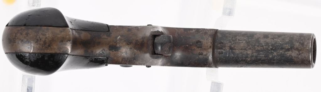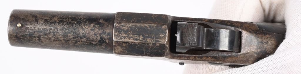 SERIAL NUMBER 462 BARREL 2 1/2" CALIBER 41 RIM FIRE MANUFACTURED 1867-88. Known as the Elliot patent Vest Pocket Deringer with birdshead grip, 2 piece rosewood grips and unique combination breechblock / hammer that later became used in Europe as the Flobert action. 2 line Remington address on barrel with pin front sight . Extremely simple and durable design. CONDITION, Good with fine grips and properly operating action. Finish has toned to a mottled blue mixed with patina. ANTIQUE