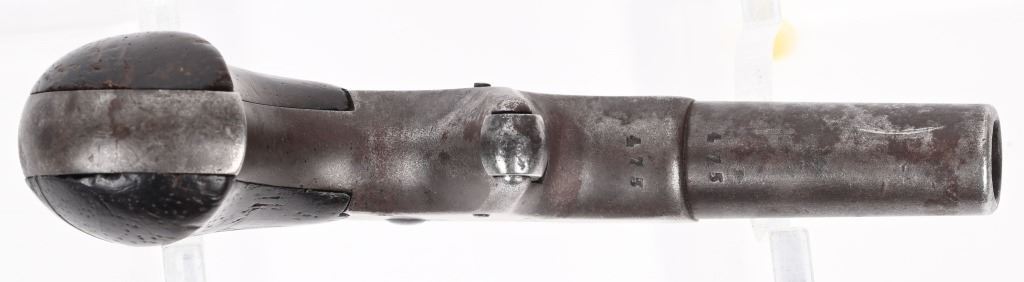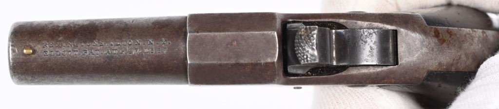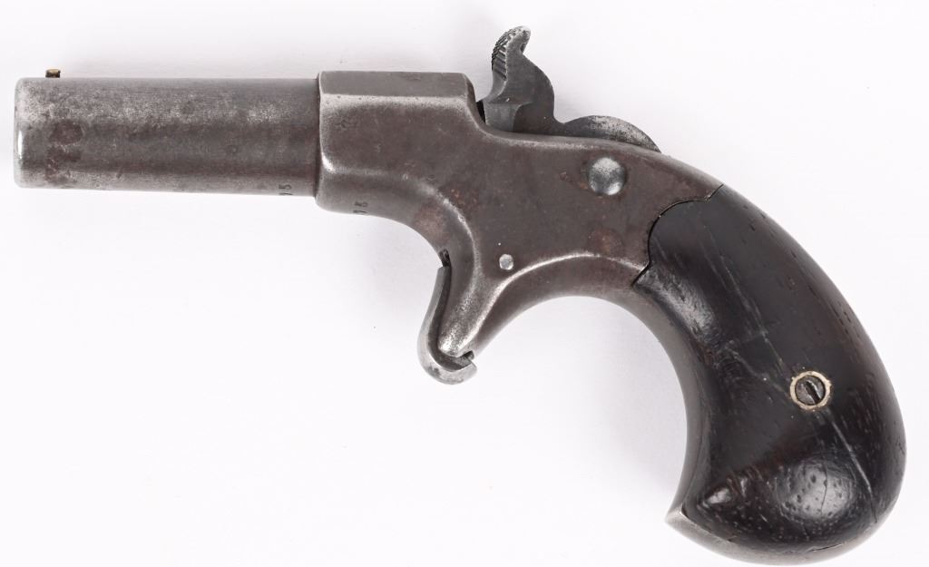 SERIAL NUMBER 475 BARREL 2 1/2" CALIBER 41 RIM FIRE MANUFACTURED 1867-88. Known as the Elliot patent Vest Pocket Deringer with birdshead grip, 2 piece rosewood grips and unique combination breechblock / hammer that later became used in Europe as the Flobert action. 2 line Remington address on barrel with pin front sight . Extremely simple and durable design. CONDITION, Good with fine grips and properly operating action. Finish has toned to a mottled blue mixed with patina. ANTIQUE
