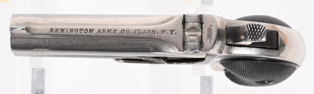 SERIAL NUMBER 553 BARREL 3" CALIBER 41 RIM FIRE MANUFACTURED 1888-1911. Nickel finished with 2 piece checkered black hard rubber grips. Top barrel flat marked "REMINGTON ARMS CO, ILLION N.Y." in a single line. CONDITION, Very good with over 90% nickel finish remaining. Fine grips with little wear. Action operates properly. Bores are very good. Hinges are solid with no cracks. C&R