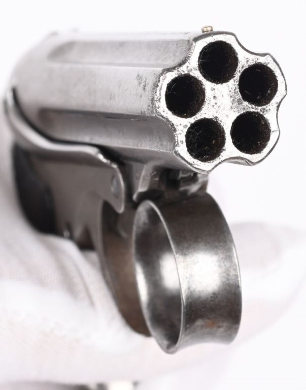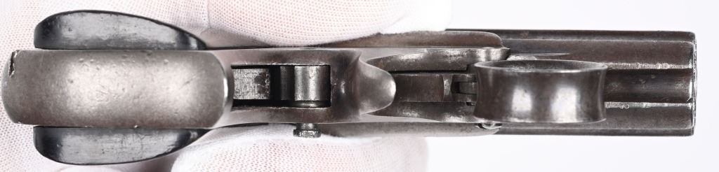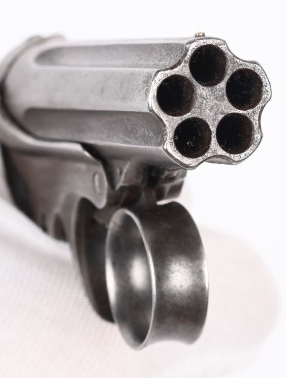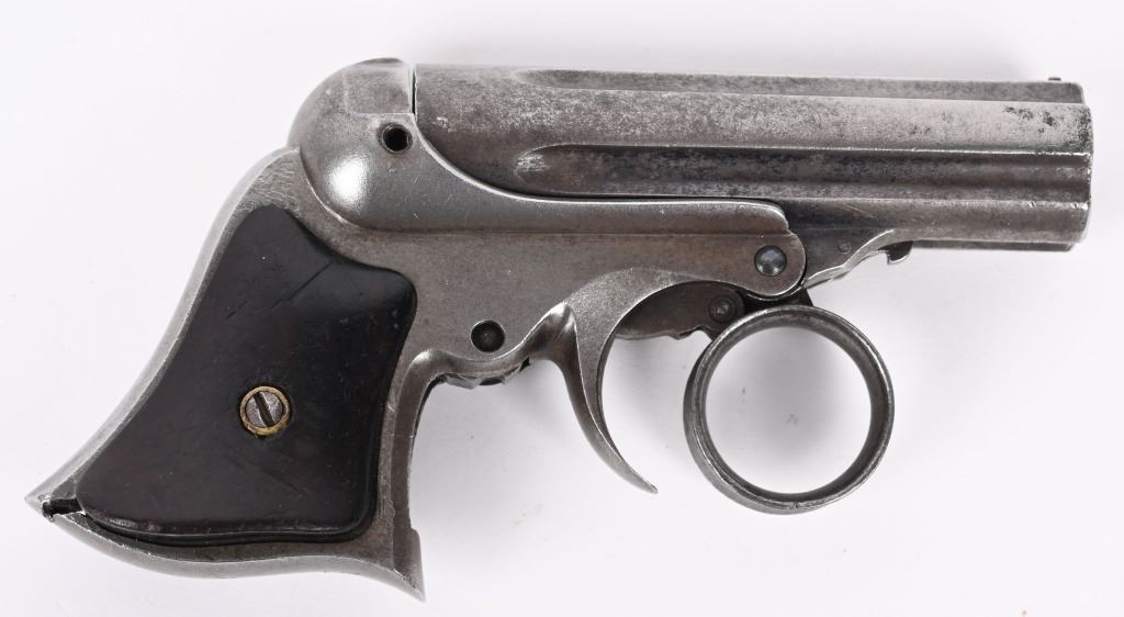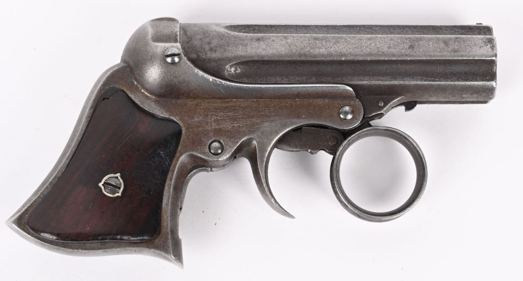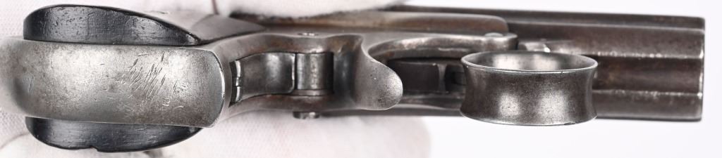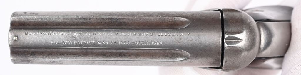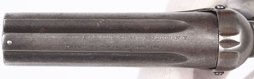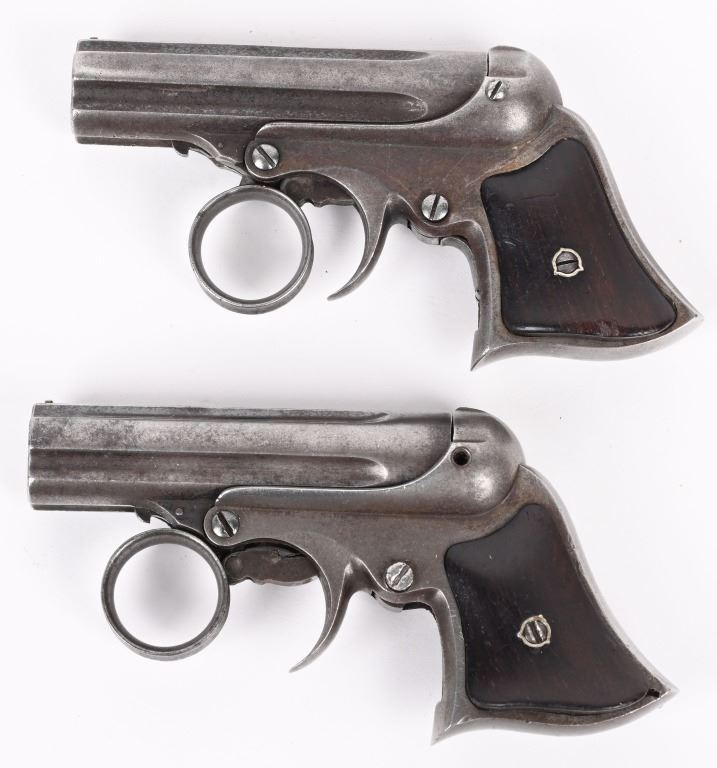 SERIAL NUMBER 2497 & 3518 BARREL 3" CALIBER 22 RIMFIRE MANUFACTURED 1863-1870. 3 inch fluted barrel cluster with 2 piece smooth rosewood grips. Top of barrel cluster marked with 2 line Remington address. Ring trigger operation operates double action and rotates a firing pin to the individual chambers of the fixed barrel cluster. CONDITION. Both pistol have worn bores with visible rifling. Good grips and exterior finish is silver patina. One pistol is missing internal striker and breech face. Other operates properly.