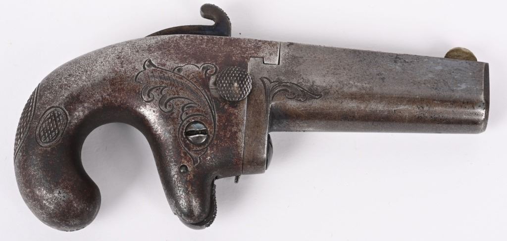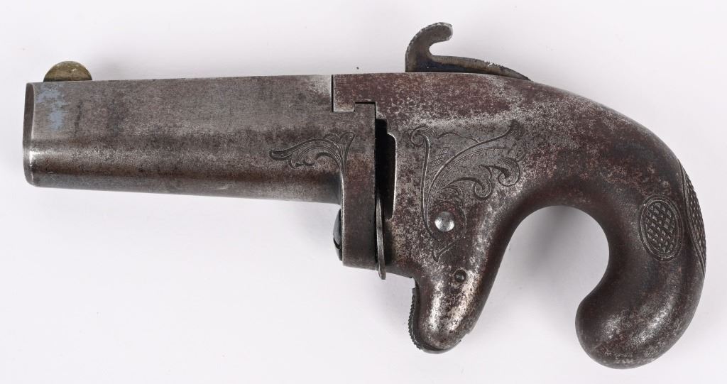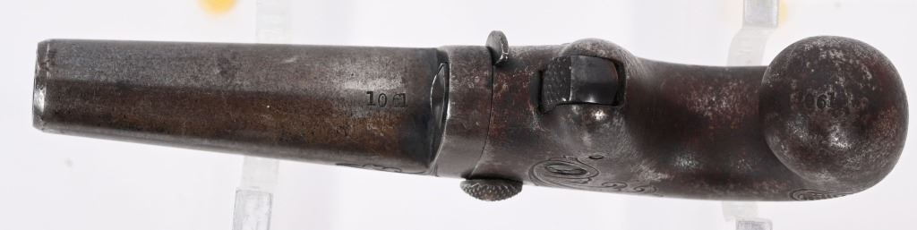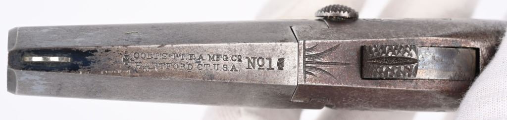 SERIAL NUMBER 1061 BARREL 2 1/2" CALIBER 41 RIM FIRE MANUFACTURED 1870-90. iron construction with spur trigger. Pivoting barrel with modest factory engraving and checkering. 2 line Colt's address on top flat & "No1" at breech. CONDITION .Good and operational with worn bore and properly operating action. Pistol has toned to a mottled brown and silver patina. ANTIQUE
