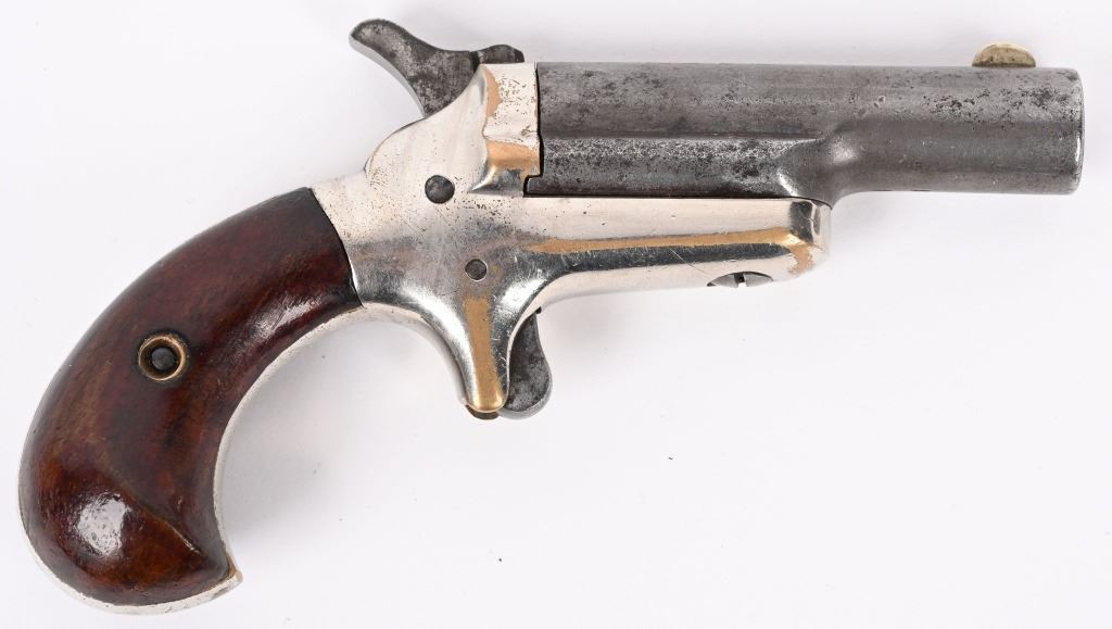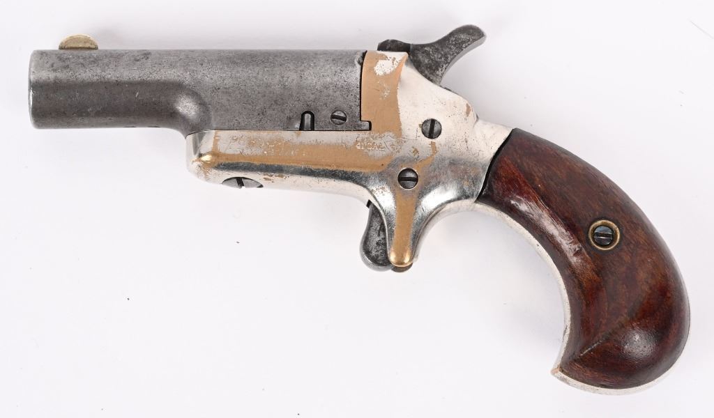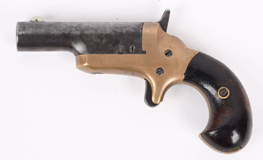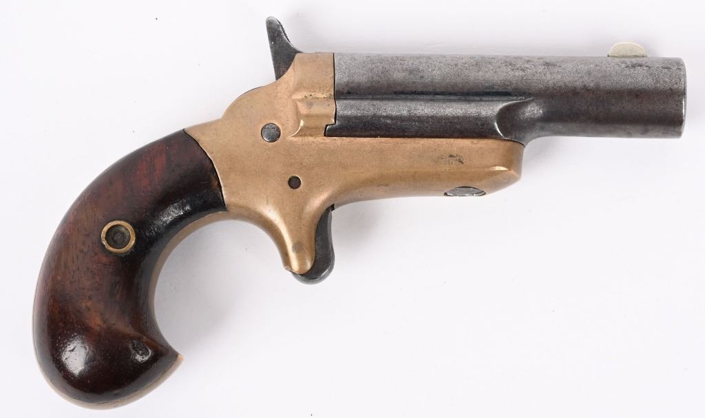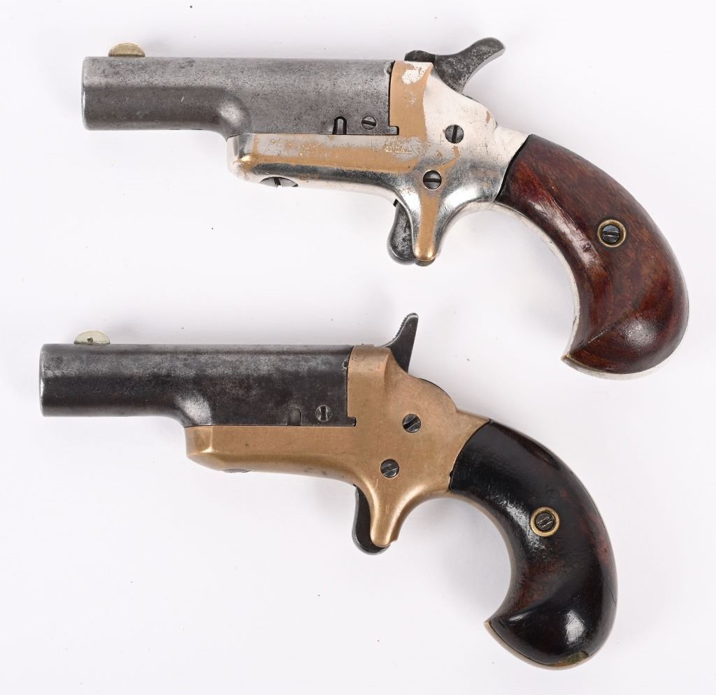 SERIAL NUMBER 6417 / 7248 BARREL 2 1/2" CALIBER 41 RIM FIRE MANUFACTURED CIRCA 1870'S. Brass frame with birds head grip. Spur trigger . One has straight hammer other has sloped hammer. Barrels marked "-COLT-" on top with serial number under 2 piece walnut grips. CONDITION. Good with proper function actions. Dark bores with visible rifling. Straight hammer example has mustard patina brass frame with brown patina barrel. Sloping hammer version has 60% nickel finish remaining and brown patina barrel. Straight hammer example has small chip in left grip other id fine. ANTIIQUE